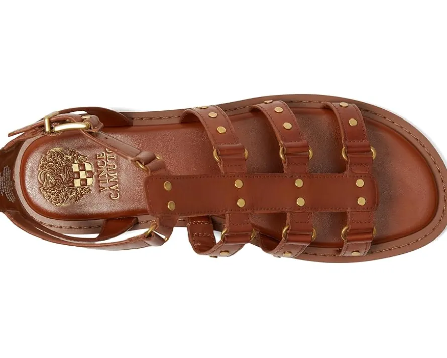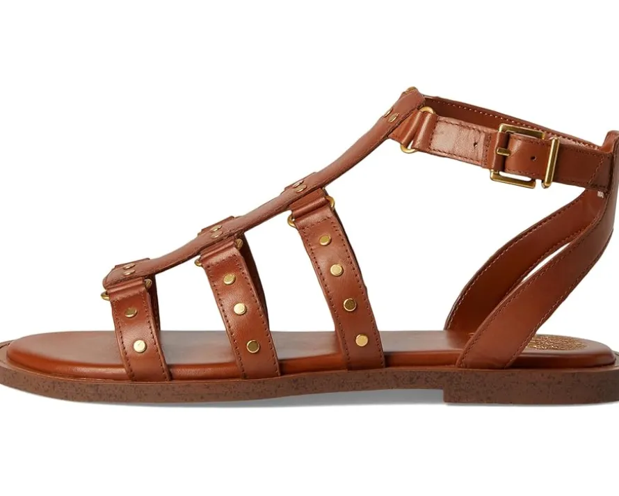 - Styled with a strappy design with metal rivets, the Vince Camuto® Claira Gladiator Flat Sandals are perfect to pair with different outfits and styles. The leather upper features an ankle strap with an adjustable buckle closure and a zippered back closure for easy wear. These flat sandals are made of a padded footbed and synthetic lining.