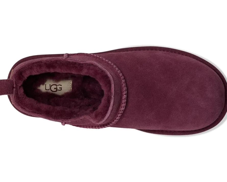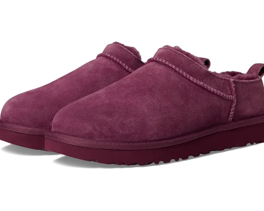 - The UGG® Classic Micro boots reimagine the fan-favorite classic boots with a new, low-profile design (and high-profile comfort). They have a genuine suede upper lined with soft fur lining and an insole that naturally regulates temperature, so you can wear socks – or not. Their lightweight sugarcane ethylene vinyl acetate outsole delivers effortless support and adds that easy slipper feeling to every out-of-the-house venture. These slip-on boots feature textile binding made from 100% recycled polyester fibers. Styled with a woven label with the UGG® logo on the insole and a UGG®-logo-embossed leather heel label, these ankle boots keep your feet comfortable, warm, and protected. While the Micro retains the strong DNA of the Classic boot, it’s fit will be closer to that of a Tasman than a Classic boot.