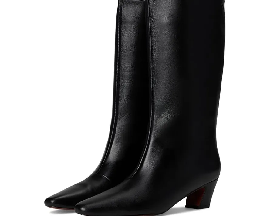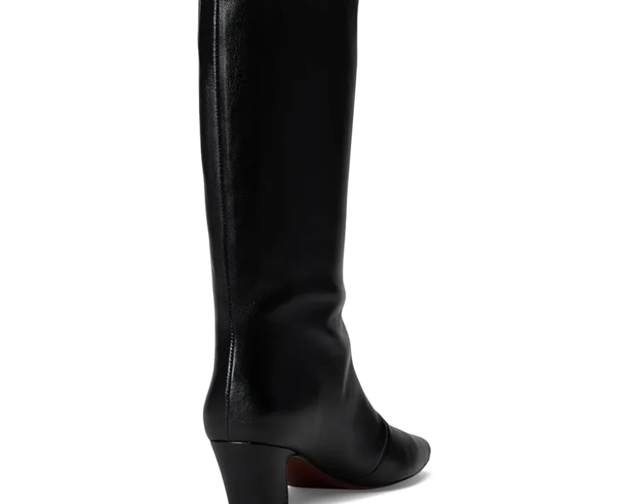 - The Loeffler Randall® Cleo Kicked Heel Calf Boots are heeled boots in brown split suede. They feature a padded leather footbed with a gold-stamped logo and a leather lining. The upper of these boots has a pull-on style for easy wear. These calf-high boots are perfect to style up your outfits and looks.