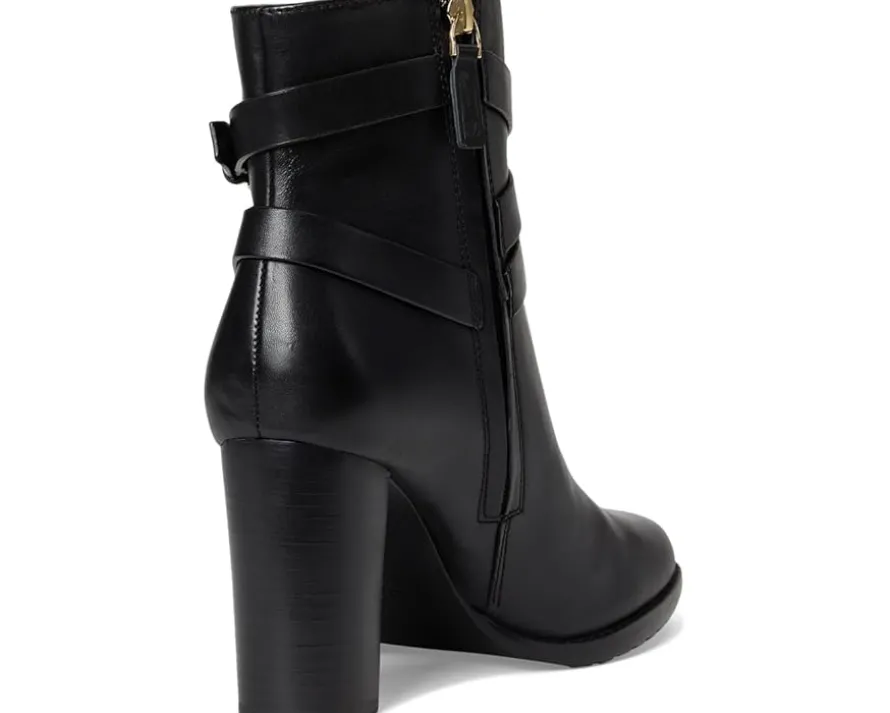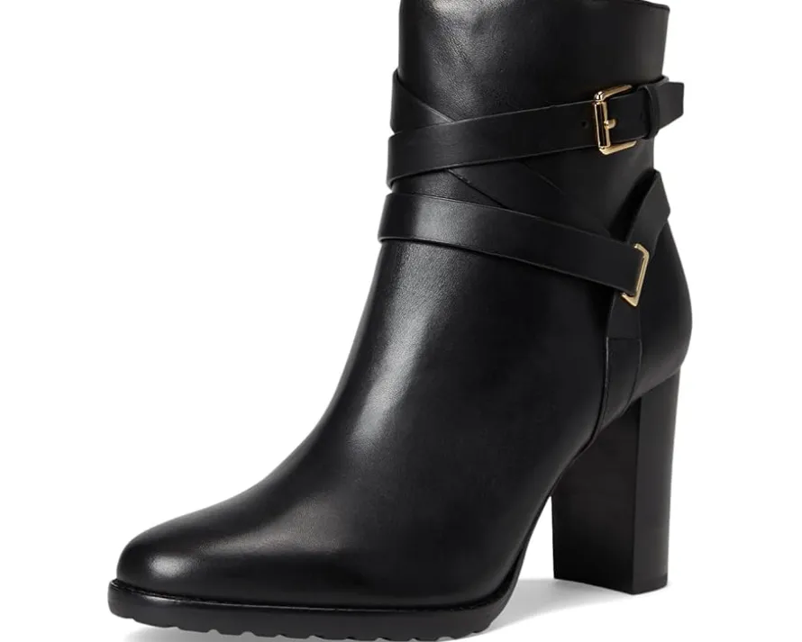 - Crafted with sumptuous burnished leather, the Lauren Ralph Lauren® Collins Burnished Leather Bootie Heel is elevated by an equestrian-inspired, wraparound crisscross ankle strap. A stacked leather heel affords added sophistication while doubling as a practical design element that ensures all-day comfort. The almond-toe boots are crafted with a leather upper, leather, cotton, & polyurethane lining, and a memory foam padded insole.