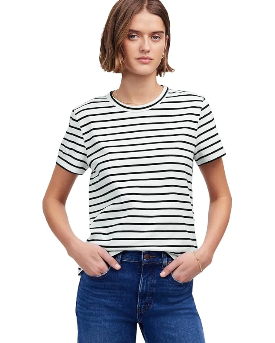 - The Madewell® Cotton Perfect Crewneck Tee Stripe is your go-to essential, blending effortless style with all-day comfort. Crafted in soft, breathable cotton, this versatile top is designed with a regular fit that flatters every figure without feeling too snug or too loose. The classic crew neck keeps it laid-back yet polished, while the short sleeves make it perfect for layering or wearing solo when the sun is out. A true pull-on staple, this tee slips seamlessly into your everyday rotation.