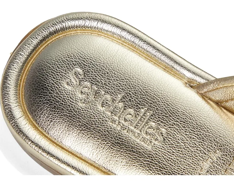 - Shimmer, slide, and shine-the courage sandal has arrived! Slip into effortless elegance wearing the Seychelles® Courage Metallic Leather Slide Sandal. Featuring a luxe leather upper that gleams in the light, these chic cross-band slides elevate any outfit with ease. The PU lining and faux leather insole provide a soft, cushioned feel, while the durable synthetic rubber outsole ensures a steady step. Designed for easy slip-on wear, they’re the go-to choice for seaside strolls, city escapades, or leisurely farmers’ market visits.