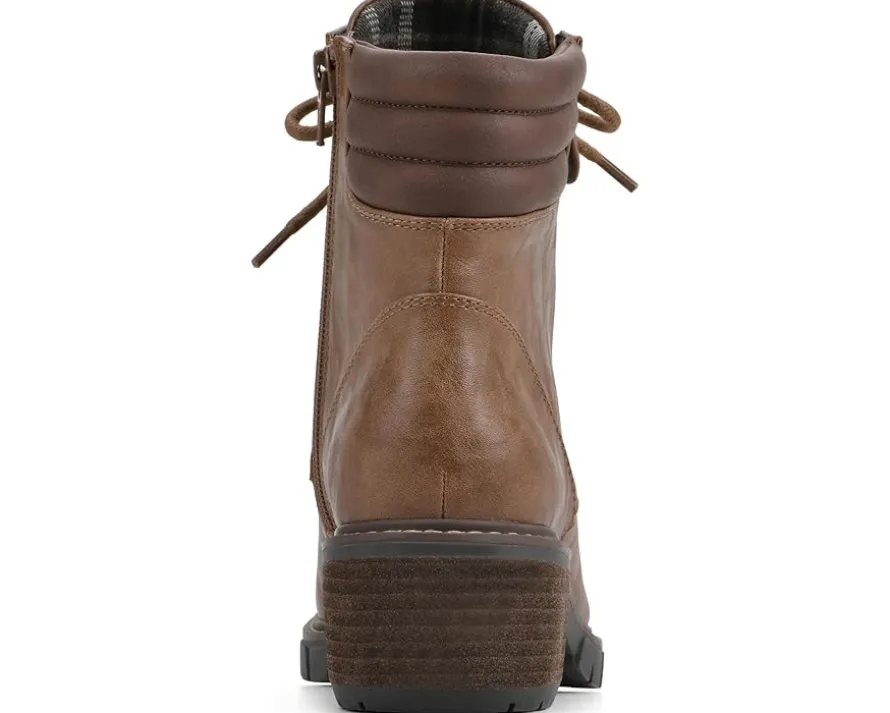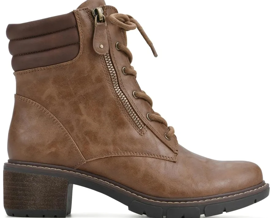 - Stack your feet in extravagant style and comfort wearing the White Mountain® Crazies Lace-Up Boots. This ankle-high footwear features durable man-made upper with textile lining and cushioned insole. With an alternative zippered side closure, this round toe pair has stacked heels and a moc toe silhouette.