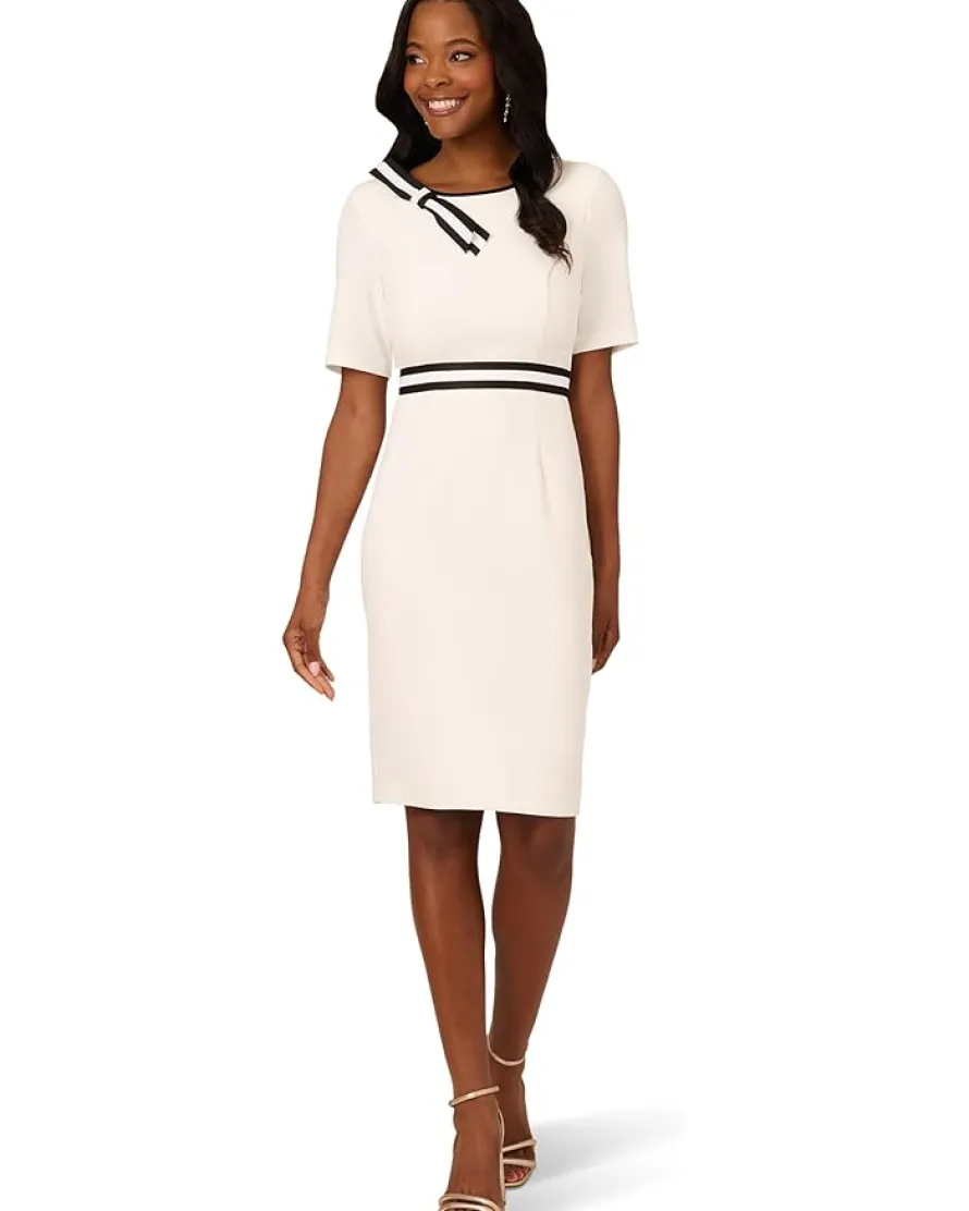 - Maintain your effortlessly chic style in the Adrianna Papell® Crepe Ribbon Short Dress. Featuring a boat neckline with short sleeves, ribbon detailing at the neckline and waist, back zipper closure, straight hemline, and a sheath silhouette.