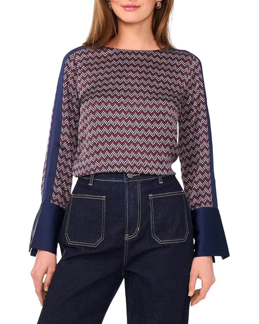 - The Vince Camuto® Crew Neck Extended Shoulder Long Sleeve Blouse with Wide Cuff is a must-have essential to your everyday style. Featuring a jewel neckline with long sleeves, flared button closure cuffs and a back keyhole with button-and-loop closure.