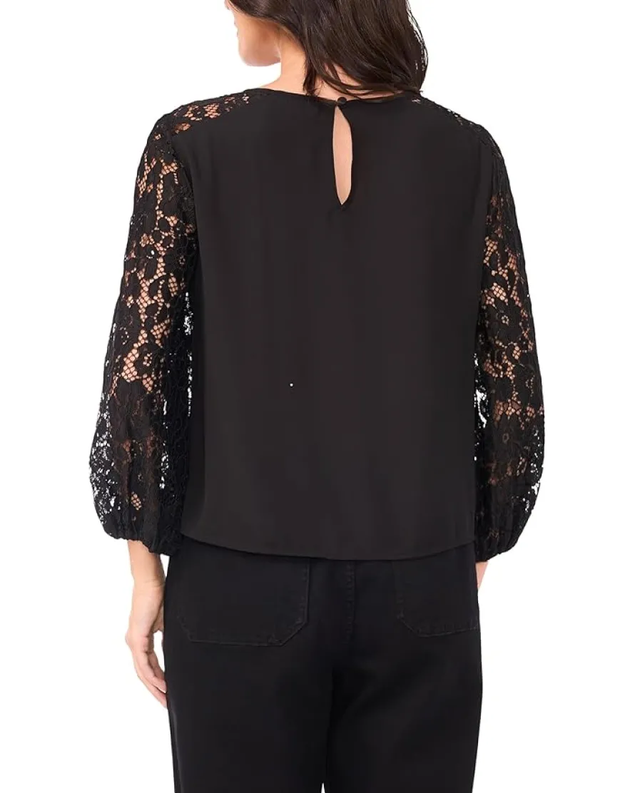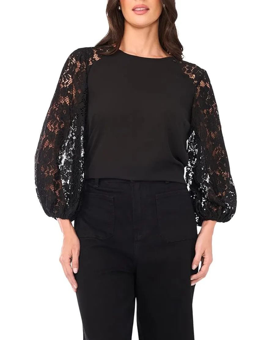 - Add a touch of elegance to your chic style in the Vince Camuto® Crew Neck Lace Sleeves Long Sleeve. This top offers a crew neckline with lace detailed three-quarter sleeves and a back button-and-loop closure.