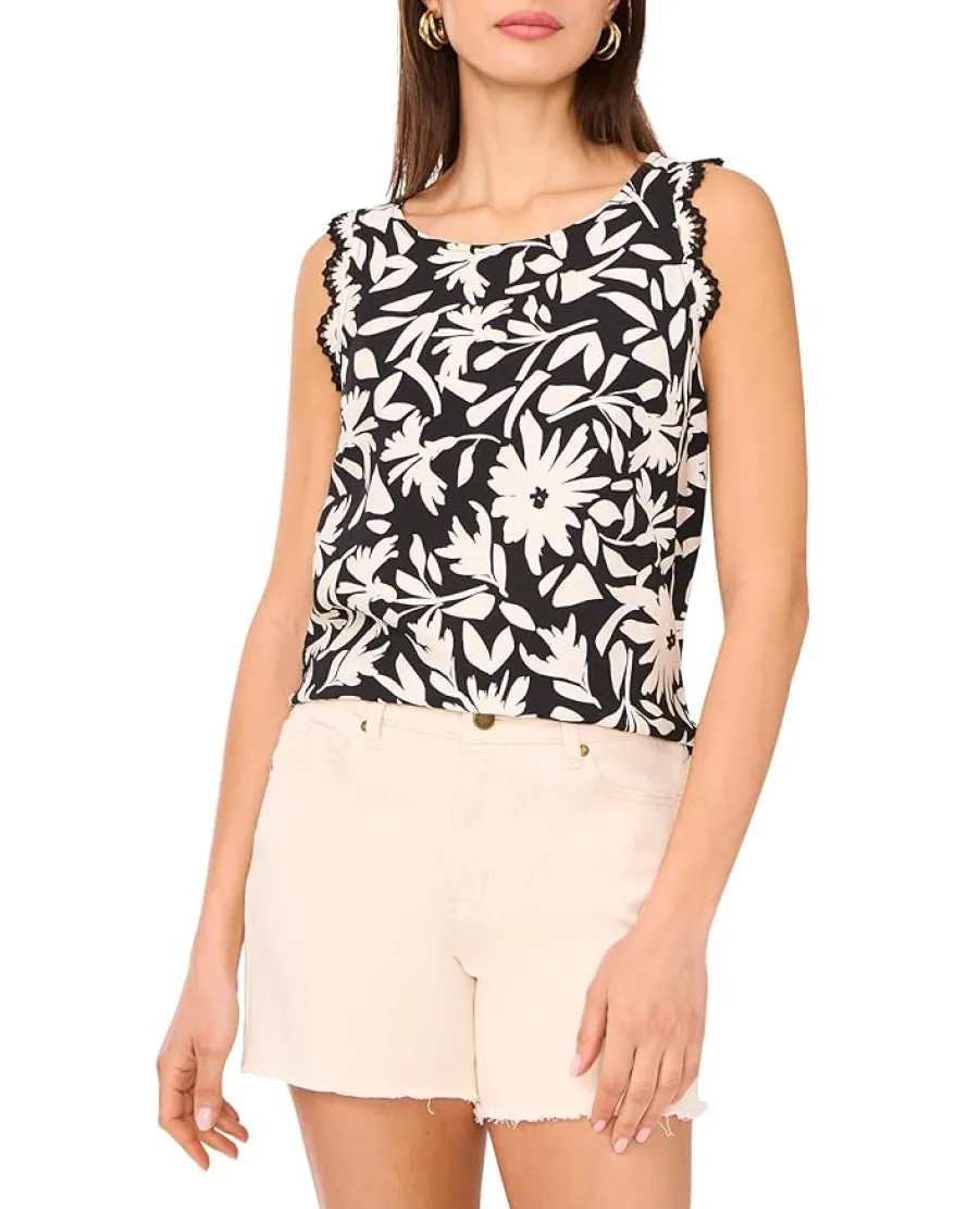 - Add a touch of elegance to your everyday look with this sleeveless tank from Vince Camuto®. Designed with a classic crew neckline and delicate lacey scalloped trims, it pairs beautifully with both tailored trousers and relaxed denim. The two-tone print adds visual interest, making it an easy pick when you want something simple yet standout.