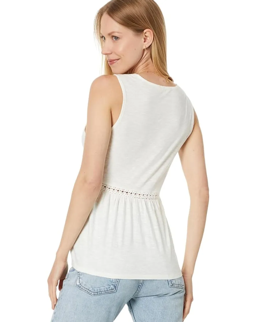 - Fun and pretty, the Lucky Brand® Crochet Trim Swing Tank is a must-have style for your warm weather wardrobe. Made of soft slub cotton jersey fabric, this tank is trimmed with crochet detailing at the chest. From brunches to city nights out, this swing tank is perfect for all your plans. The pull-on style tank features a split neck, sleeveless design, and drawstring ties for a flattering fit.