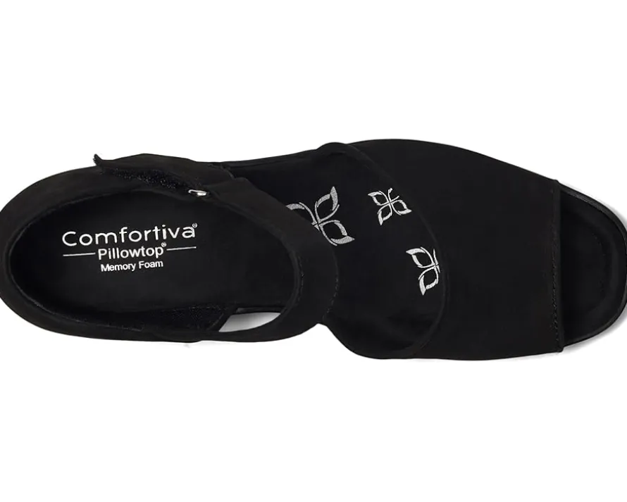 - The Comfortiva® Daniella sandals are two-piece sandals with lightweight wedge heels that work for different occasions. These heeled sandals are made of a foam insole, microsuede memory foam sock lining, and faux suede lining. The leather upper features a hook-and-loop strap for a secure fit.