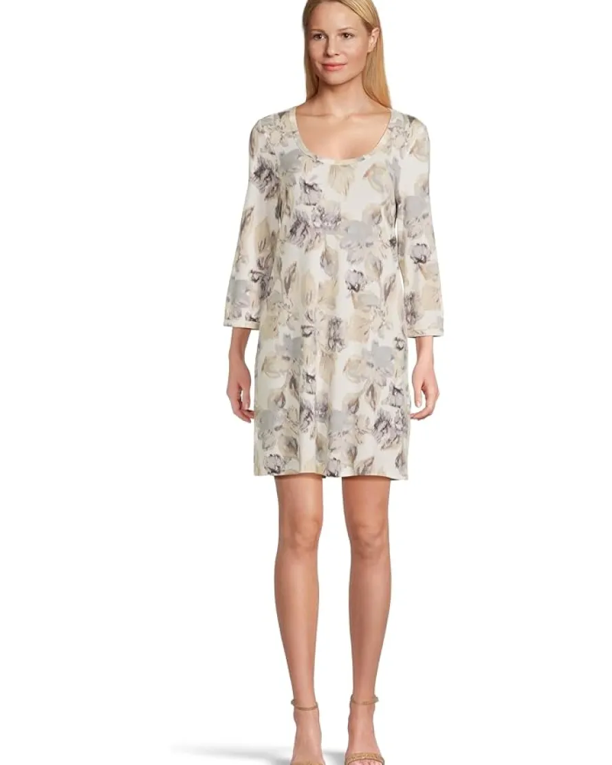 - Printed long-sleeve short dress with a hint of stretch and chic scoop neck. Wrinkle resistant, UV-rated. A perfect addition to your warm weather style!