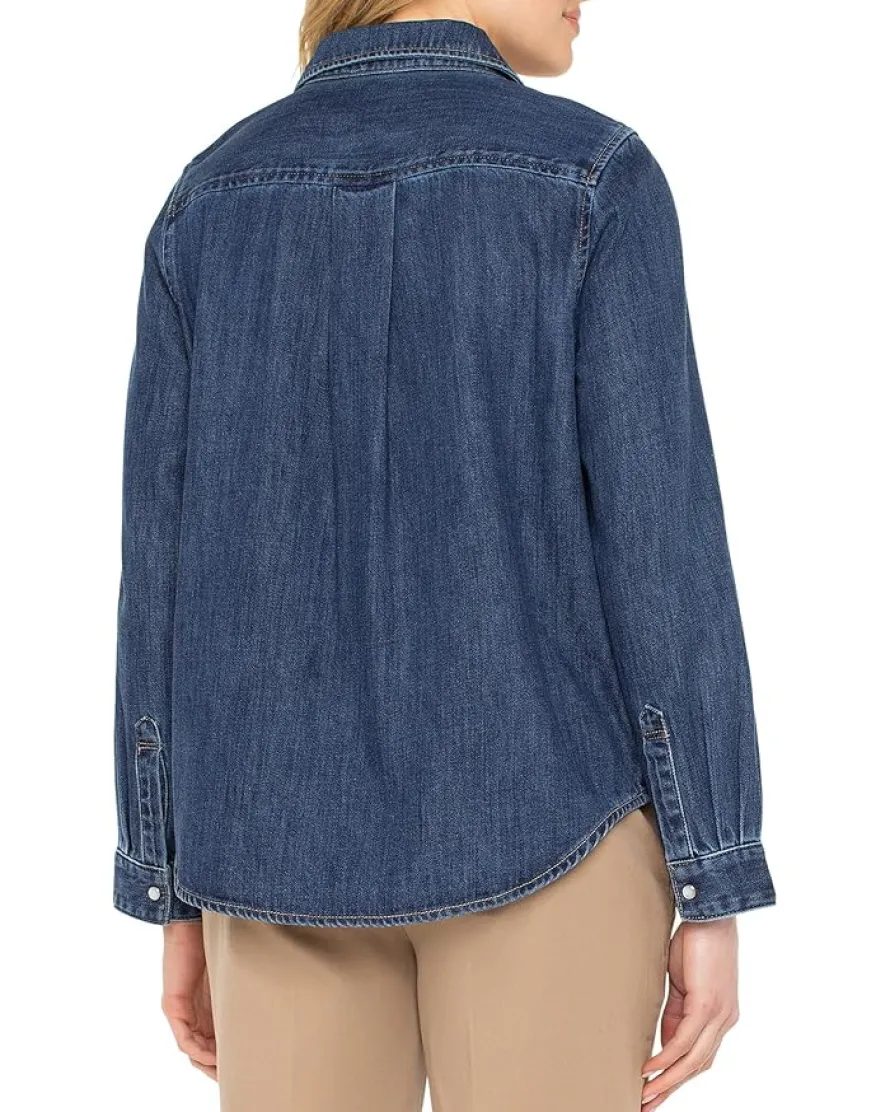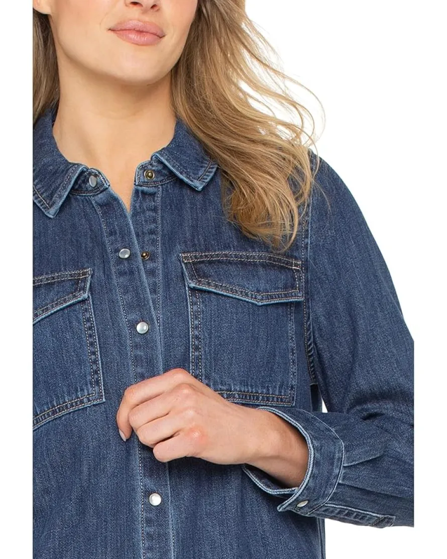 - The Liverpool™ Los Angeles Denim Button-Down Long Sleeve Shirt With Pockets features pearlescent buttons, making it an easy-to-wear piece that can be dressed up or down! The button-down, easy breezy denim shirt has a collared neckline, long sleeves with buttoned cuffs, and curved hem.