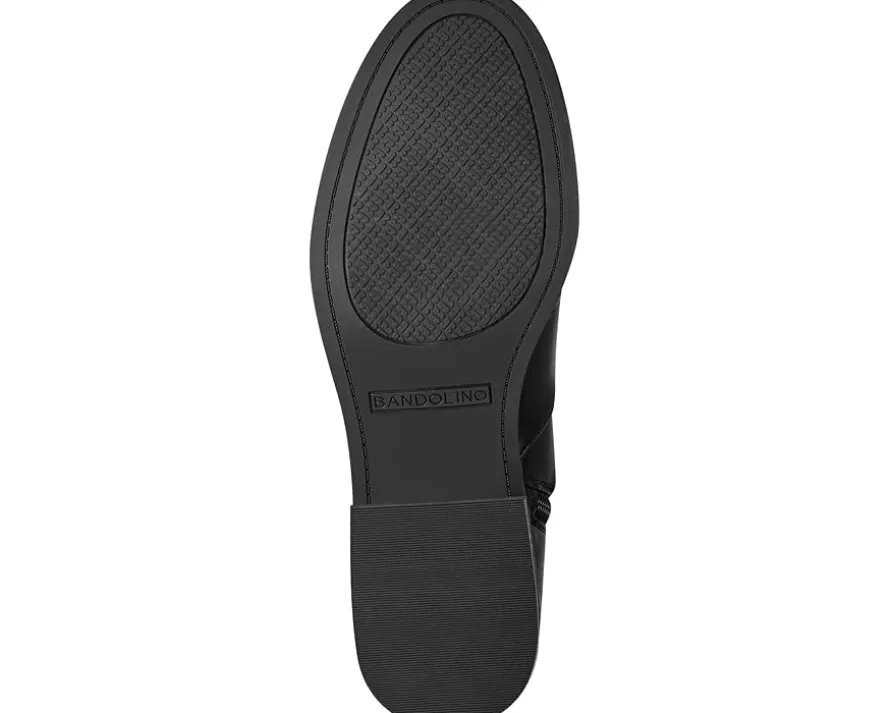 - Add a hint of charming flair to your ensemble wearing the Bandolino® Dennie riding boots. This knee-high footwear has eye-catching hardware at the sleek ankle strap and a cushioned footbed for all-day comfort. The synthetic upper is accompanied by a block heel and side zipper for easy entry.