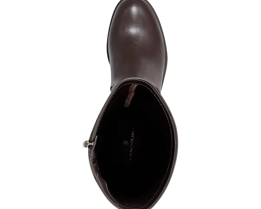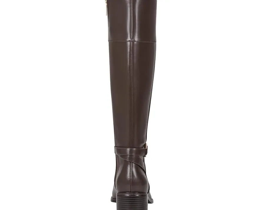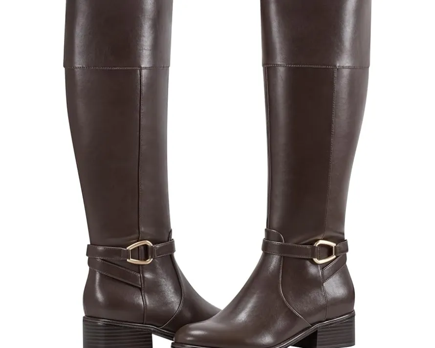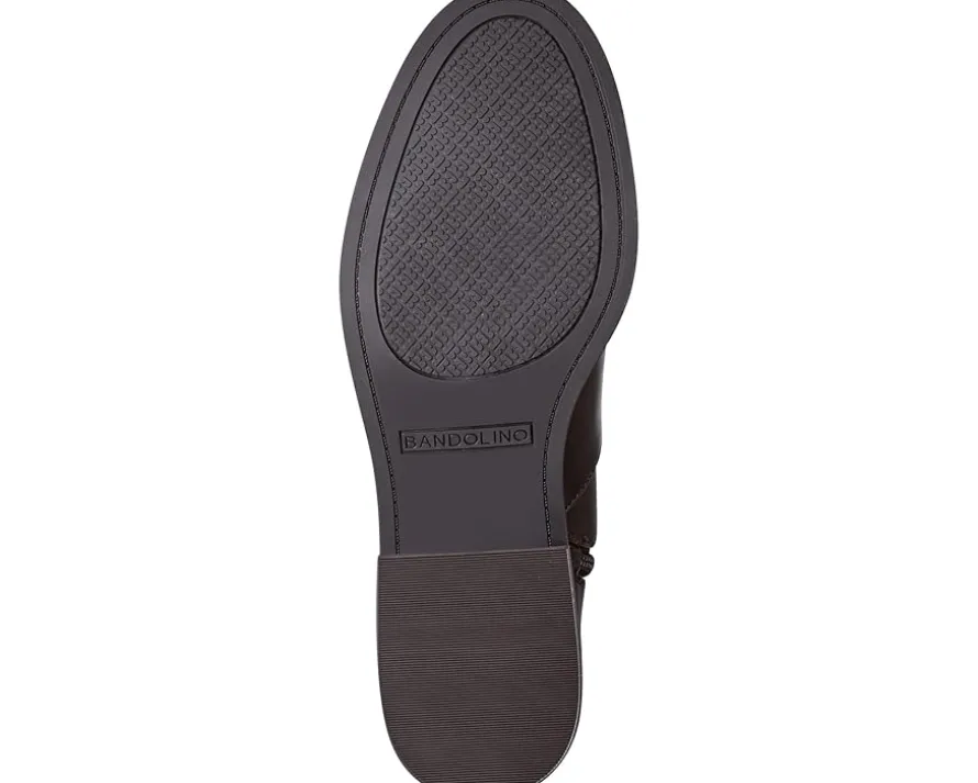 - Add a hint of charming flair to your ensemble wearing the Bandolino® Dennie riding boots. This knee-high footwear has eye-catching hardware at the sleek ankle strap and a cushioned footbed for all-day comfort. The synthetic upper is accompanied by a block heel and side zipper for easy entry.