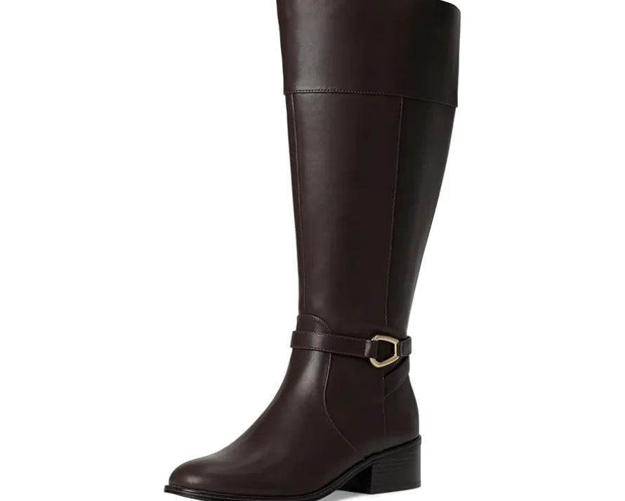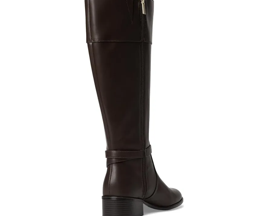 - Add a hint of charming flair to your ensemble wearing the Bandolino® Dennie riding boots. This knee-high footwear has eye-catching hardware at the sleek ankle strap and a cushioned footbed for all-day comfort. The synthetic upper is accompanied by a block heel and side zipper for easy entry.