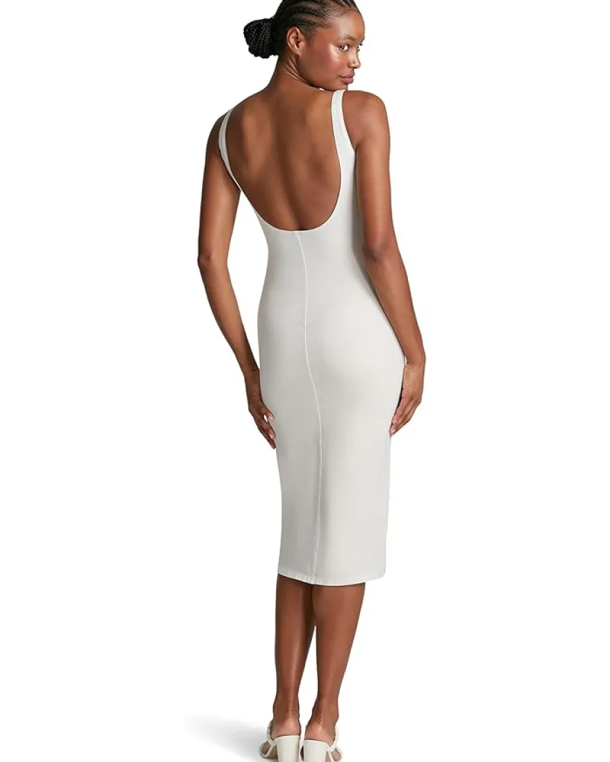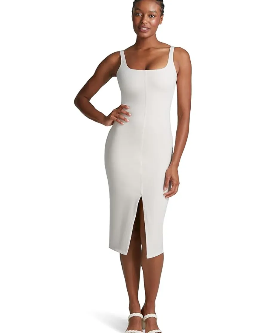 - Dress up in the gorgeous Commando™ Do It All Denim Midi Tank Dress, that offers a four-way stretch and an ultra-soft feel. The midi dress features a fitted construction, squared neck, solid pattern, sleeveless design, low-back design, and a front slit detail.