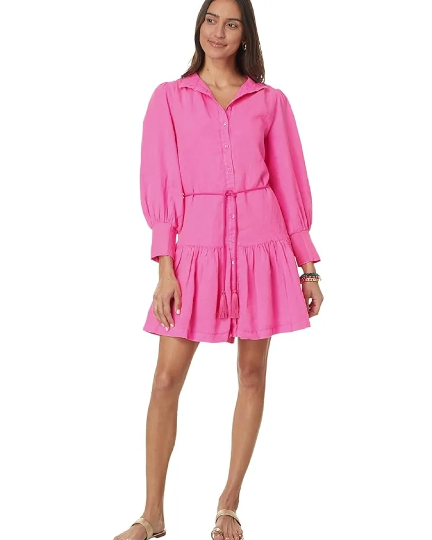 - Lilly Pulitzer® perfection, the Drena Linen Dress. This easy-fit shirtdress features a sophisticated stand collar and a full button placket, offering a classic fit that’s both flattering and versatile. Long quarter length sleeves with tall cuffs and a playful hem ruffle add a touch of charm, while the separate rope belt with tassel cinches your waist for a defined silhouette. Perfectly above the knee, this dress is designed to keep you cool and stylish from day to night, making it your go-to for any occasion.