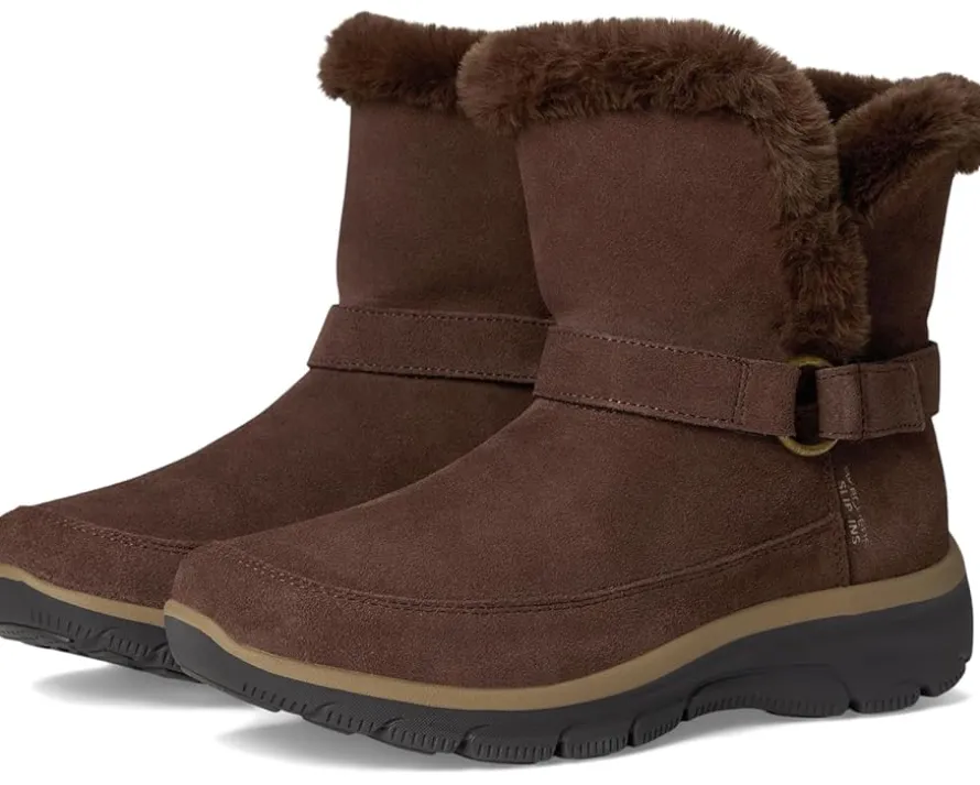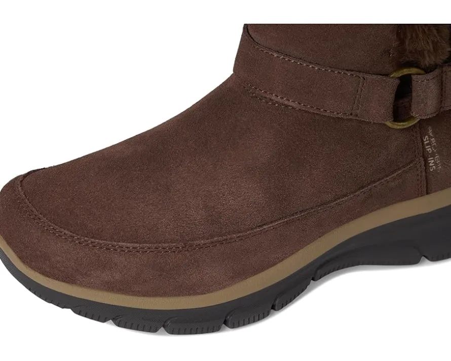 - Simply step into the season with effortless cozy comfort wearing SKECHERS® Easy Going – Dreamers Luxe Vibe Hands Free Slip-ins. Designed with the exclusive Heel Pillow™, this boot features a 3M® Scotchgard® treated suede upper with faux fur trim and lining, wrapped buckle detail and a cushioned Skechers Air-cooled Memory Foam® insole.