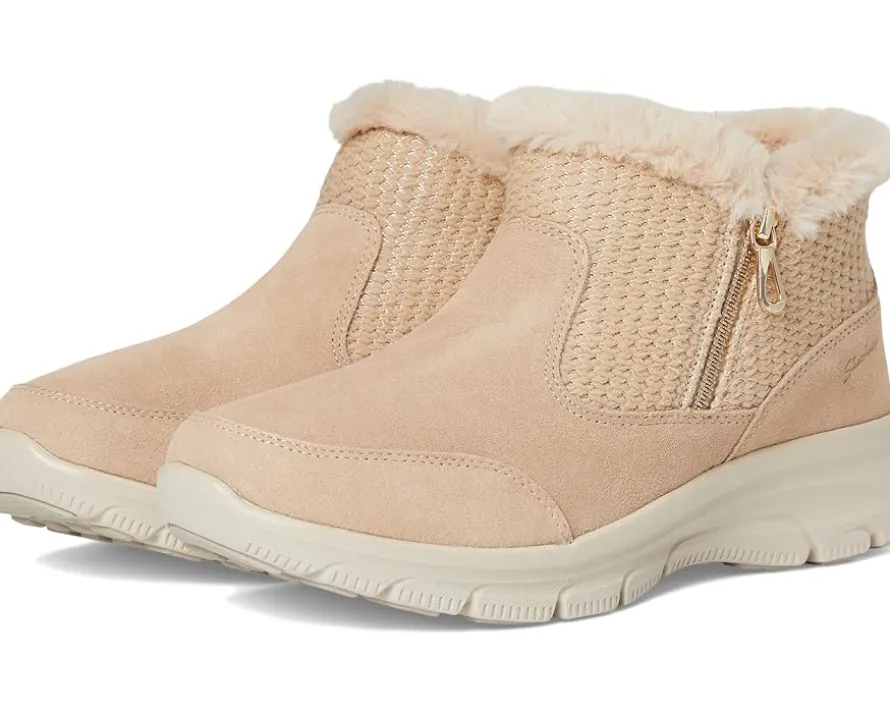 - Style that feels like a hug, SKECHERS® Easy Going – Gentle Fall. Designed to keep you warm and on-trend, this ankle-high beauty features a soft suede and sweater knit upper accented with a plush faux-fur trim that screams cozy season goals. The zippered side closure makes slipping in and out a breeze, while the moc toe and wedge heel add just the right touch of laid-back sophistication. Inside, the SKECHERS Air-Cooled Memory Foam® cushioned insole hugs your feet in unmatched comfort, and the durable rubber outsole ensures grip with every step.