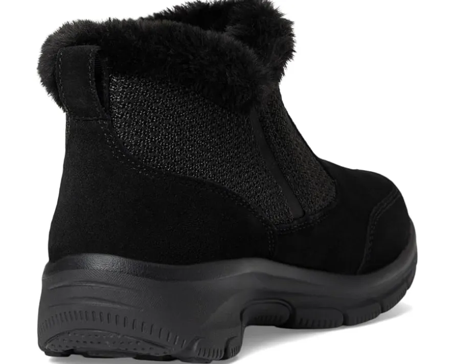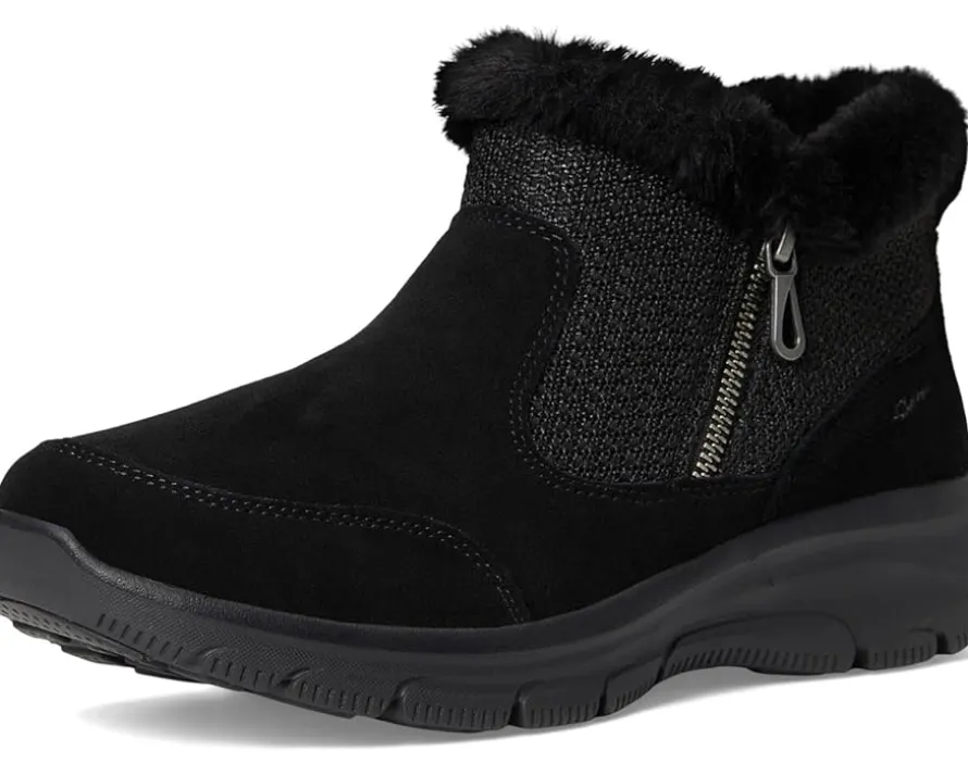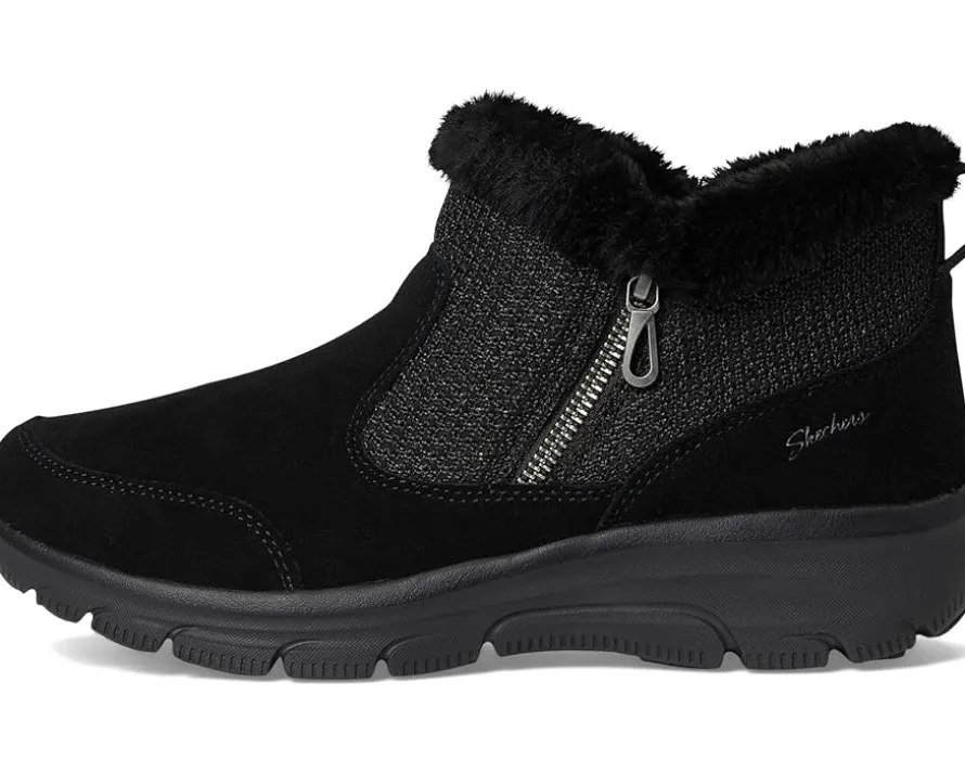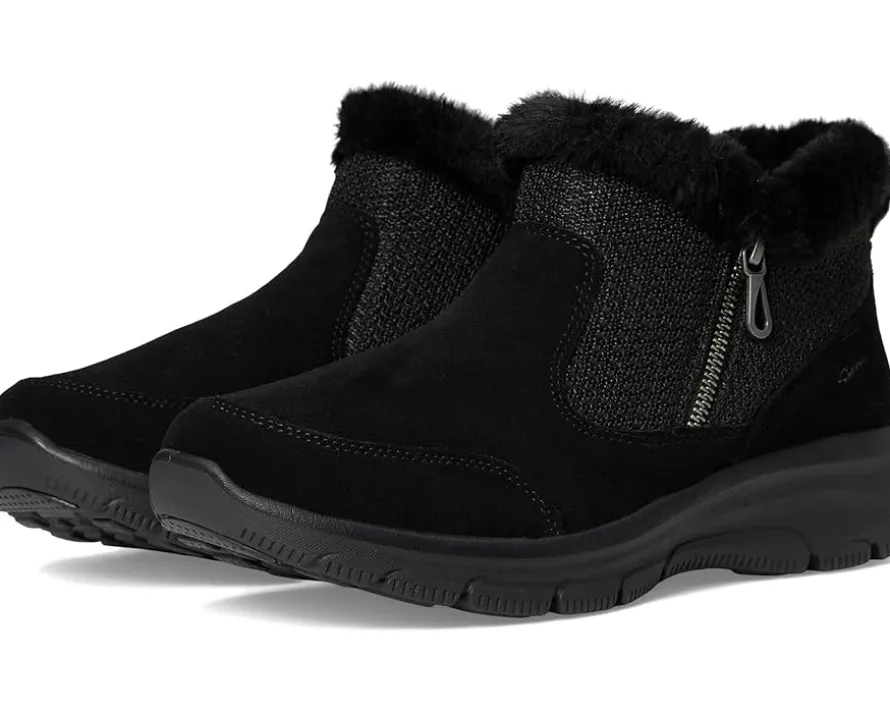 - Style that feels like a hug, SKECHERS® Easy Going – Gentle Fall. Designed to keep you warm and on-trend, this ankle-high beauty features a soft suede and sweater knit upper accented with a plush faux-fur trim that screams cozy season goals. The zippered side closure makes slipping in and out a breeze, while the moc toe and wedge heel add just the right touch of laid-back sophistication. Inside, the SKECHERS Air-Cooled Memory Foam® cushioned insole hugs your feet in unmatched comfort, and the durable rubber outsole ensures grip with every step.