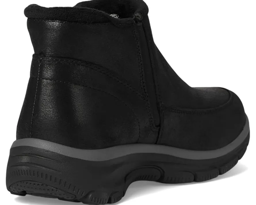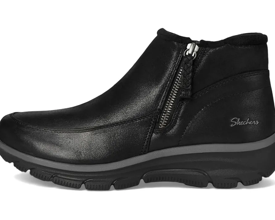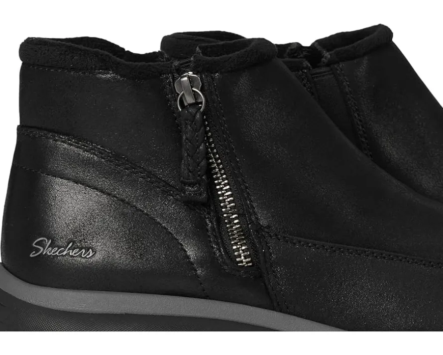 - Treated with 3M® Scotchgard® to resist water and stains, the SKECHERS® Easy Going – Into Fall bootie is a cute cool weather style. This water-repellent ankle boot features smooth vegan leather upper with a faux fur trim, side zip closure, and a Skechers Air-Cooled Memory Foam® insole.