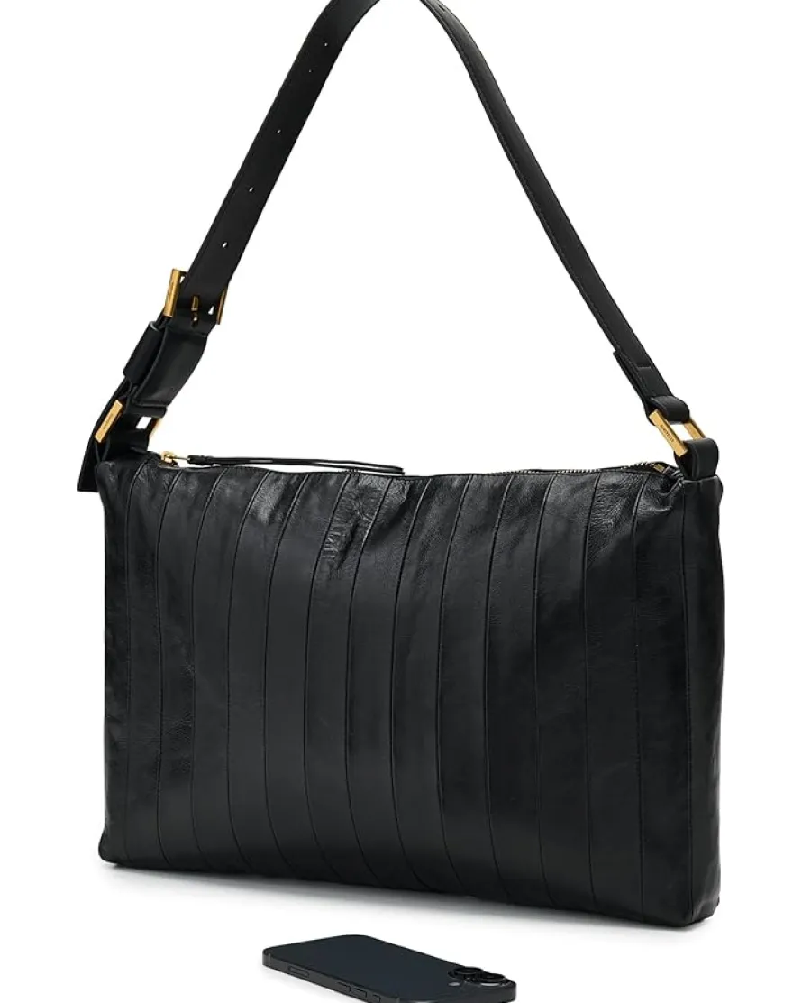 - Discover the AllSaints™ Edbury Panel Shoulder Bag, expertly crafted to elevate your style from street to chic effortlessly. Made from premium cow leather, its quilted finish brings that luxe texture you can feel, while the brand’s signature metal hardware adds an edgy, iconic touch. Designed with intention, the Edbury features one spacious compartment and two smart pockets, giving you effortless organization without compromising style. The secure zipper closure keeps your essentials safe as you move through your day.