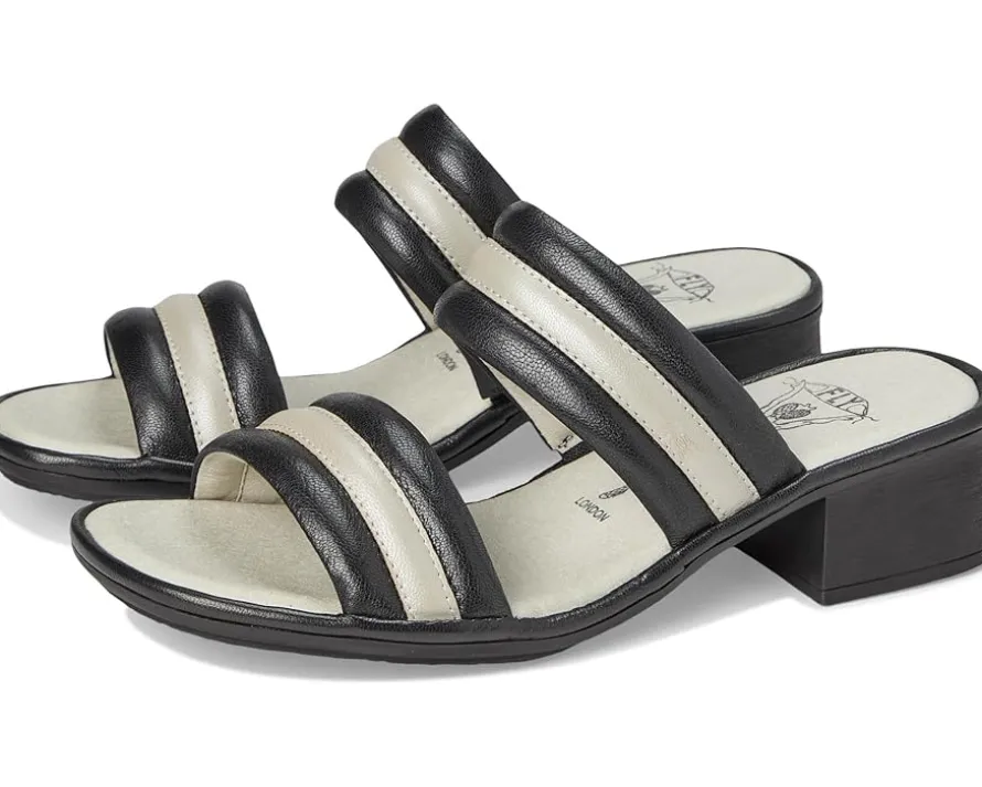 - The stitch-down construction of the FLY LONDON® EITY580FLY sandals allows for great flexibility. These heeled sandals are made of a foam insole and polyester lining. The soft leather upper is beautiful and the heel-to-toe padded insole, rounded toe shape, and flexible rubber outsole add comfort to your feet.