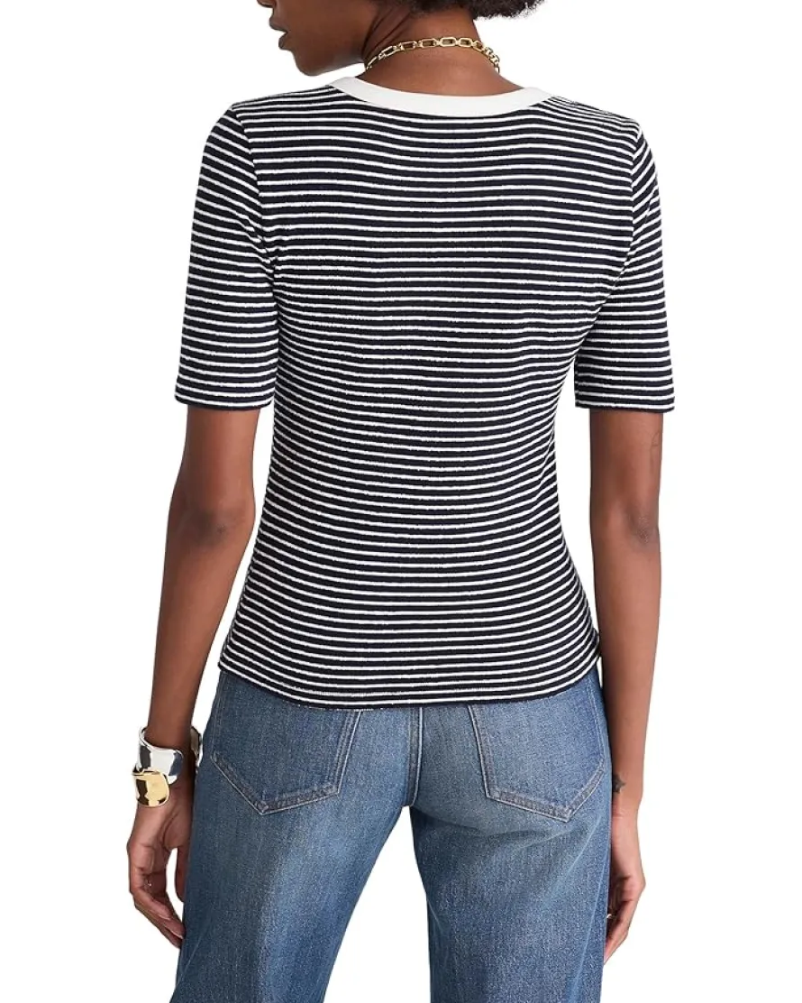 - A beautiful allover striped print and classic silhouette, make the Madewell® Elbow Sleeve Henley Top a wardrobe essential. The pull-on style top features a henley neck with half-button closure, short sleeves, and a straight hem.