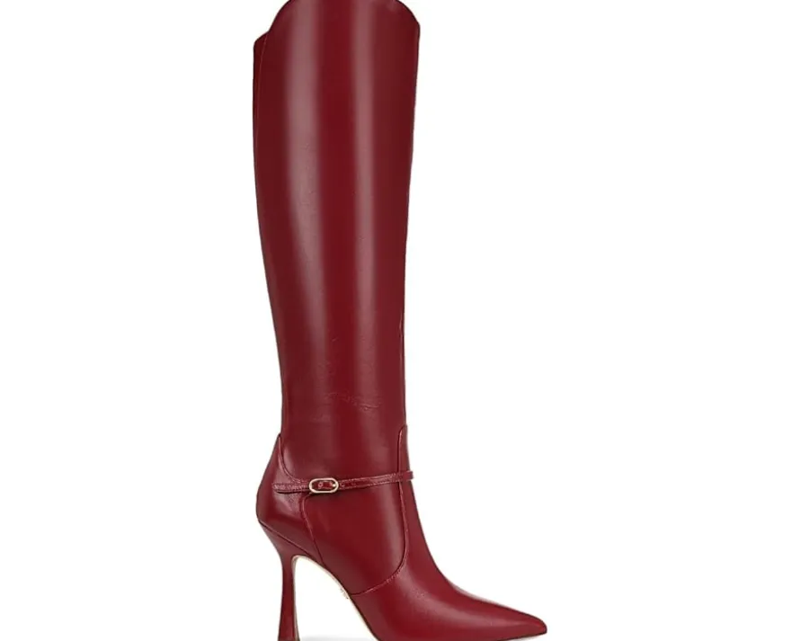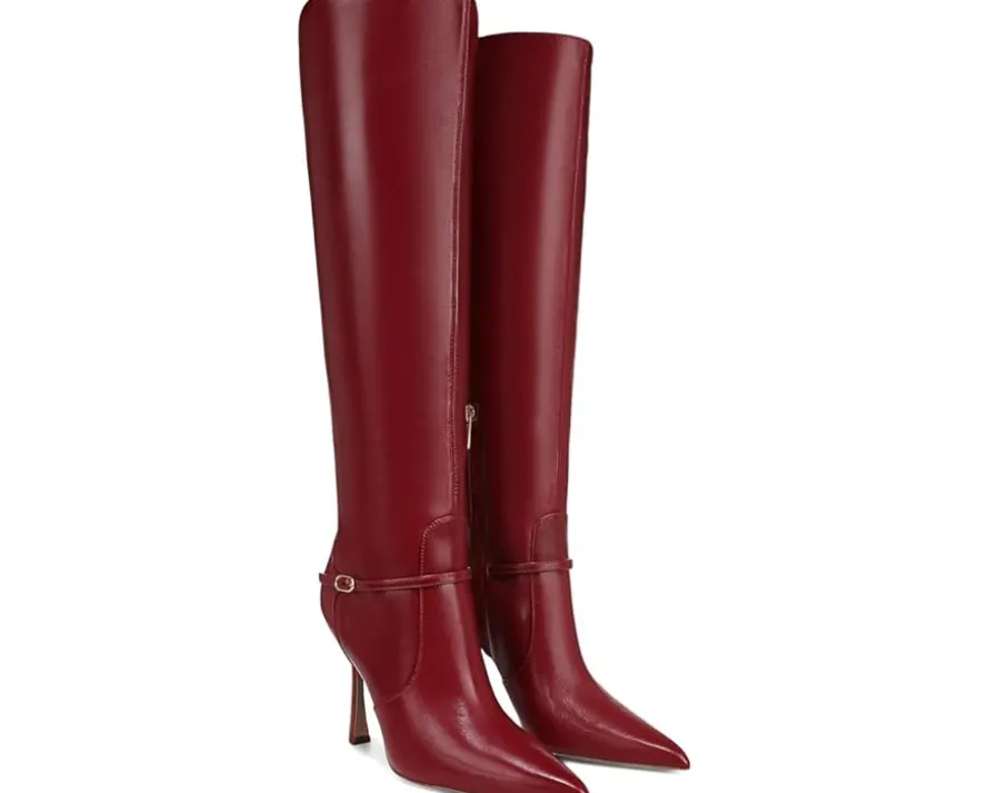 - Feel sky-high wearing the Sam Edelman® Elia boots with belt detailing and tapered stiletto heels. The leather upper of these boots features fall textures and chunky knits for a sleek look. These tall boots are crafted with a polyurethane insole and lining for all-day comfort. These above-the-knee heeled boots add a glamorous look to your outfits and styles.