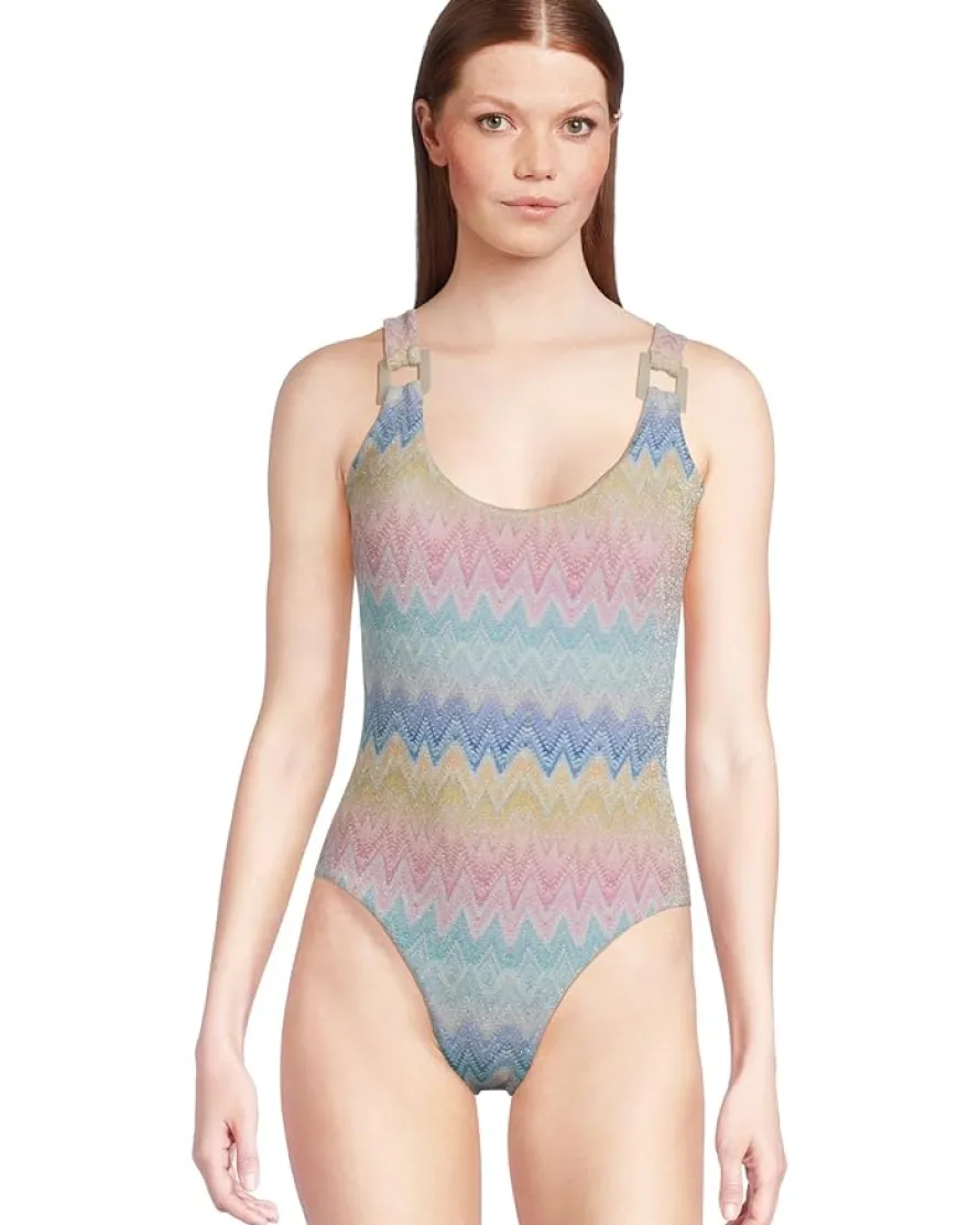 - Dive into dazzling style wearing the Beach Riot® Elina One-Piece. Featuring a sleek scoop neck and sleeveless silhouette, this stunner is designed to flatter and support with removable cups that let you customize your fit. The eye-catching metallic chevron shimmer catches the light with every move, while pearl hardware on the straps adds a touch of luxe sophistication.