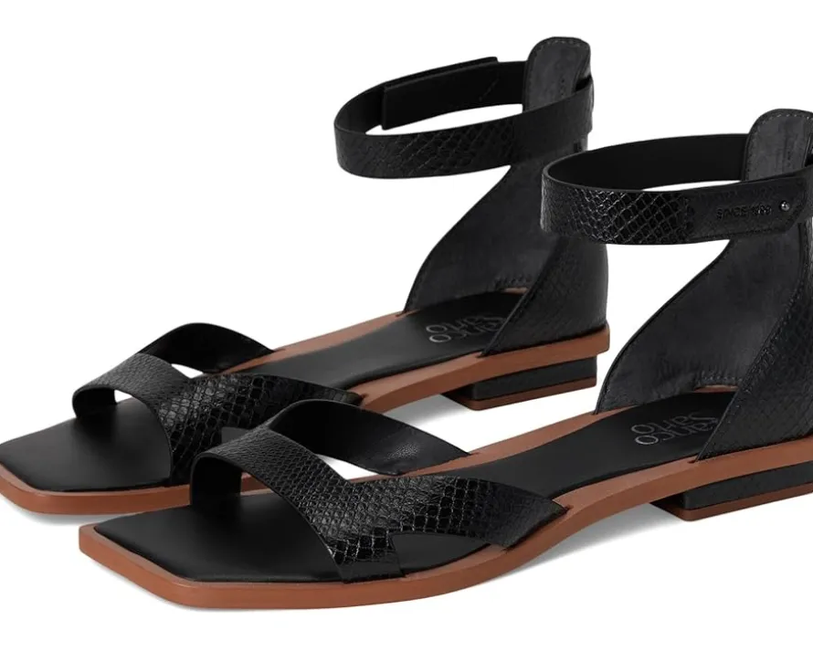 - Your style, simplified wearing Franco Sarto® Elisa. Designed with a sleek faux leather upper and a modern square toe, these sandals are the perfect blend of fashion and function. The slip-on design, complemented by a secure hook-and-loop closure, ensures an easy, adjustable fit. A PU lining and faux leather insole provide all-day comfort, while the synthetic rubber outsole offers durable traction. The eye-catching straps and standout materials make these sandals a statement piece, effortlessly elevating any ensemble.