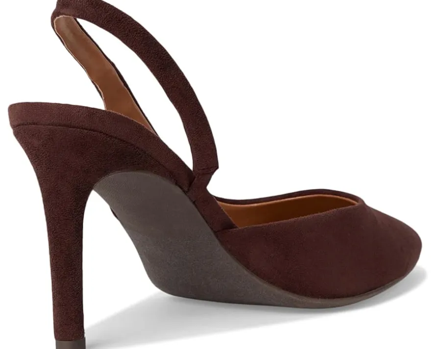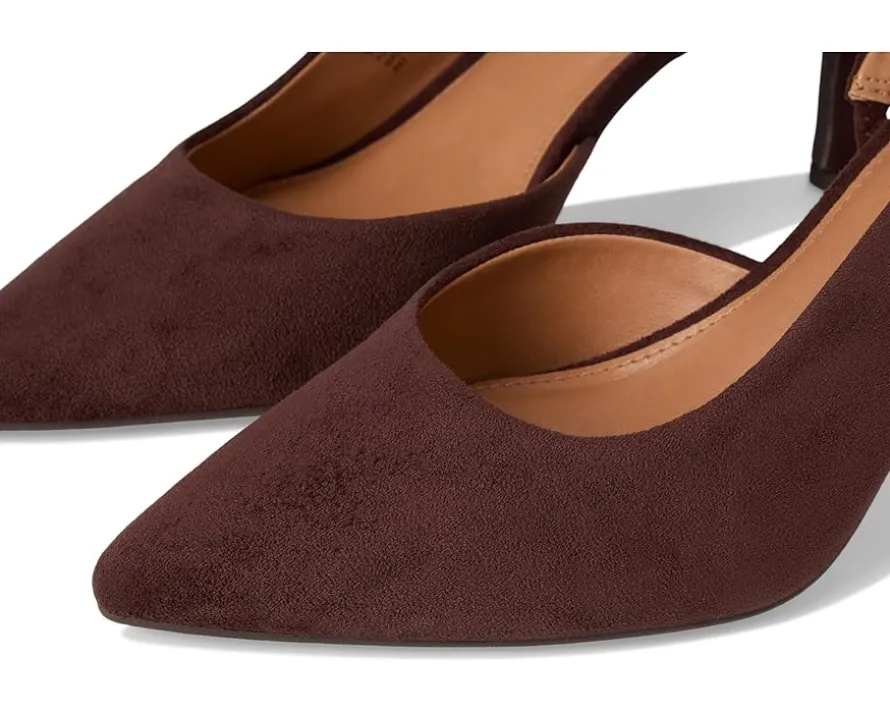 - Slingback strap with buckle closure.