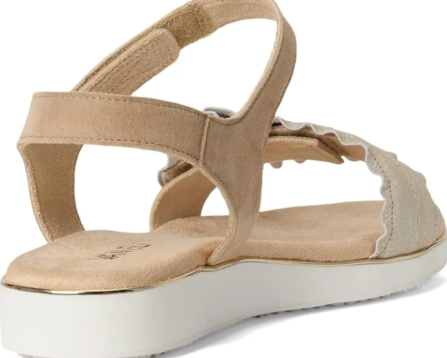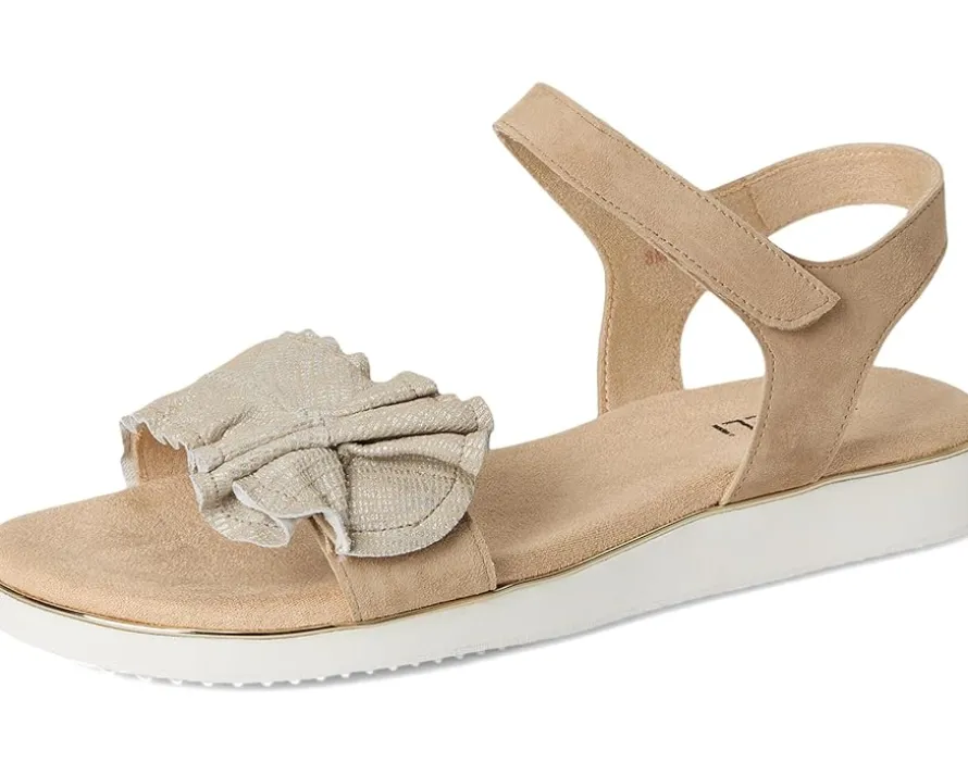 - The Vaneli® Elsbet sandal features ruffle-strap detailing and a hook-and-loop closure, ensuring a secure and adjustable fit. The hidden elastic insert under the buckle adds extra comfort, while the padded insole provides cushioning for all-day wear.