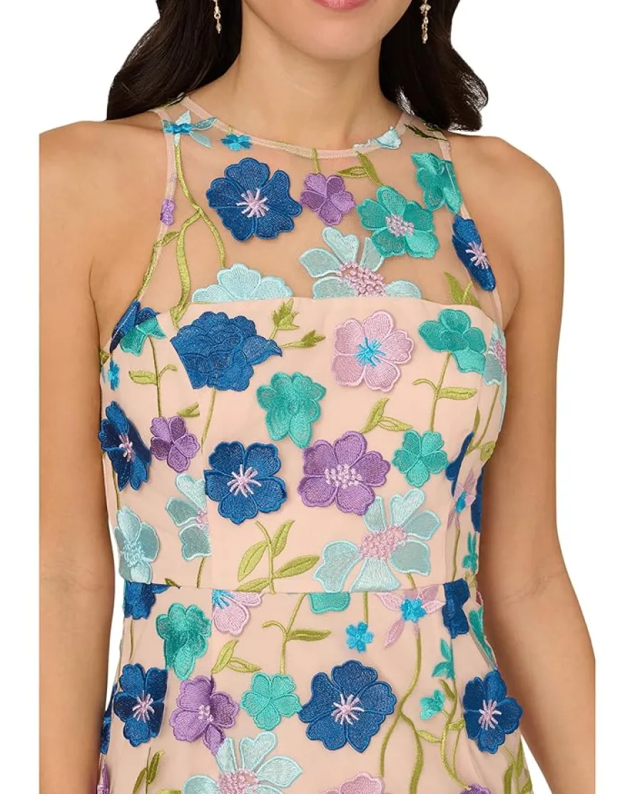 - Get ready for a fun party or casual date by wearing the Adrianna Papell® Embroidered Column Midi Dress. The lace detailing on the neckline and back gives it an eye-catching appeal. This printed dress is designed with a sleeveless style and a halter neckline. The zippered back closure of the dress offers easy wear while the slit at the back makes it easy to move around. Grab everyone’s attention at the party by wearing this embroidered dress.