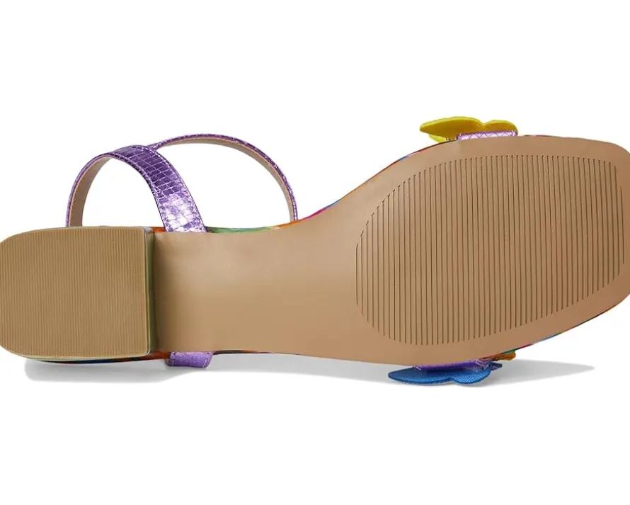 - Perfect for any fashionista, make your style statement wearing the Blue™ by Betsey Johnson Emerry heels. They are made of a faux leather upper, insole, and lining. Styled with a bright print and butterfly embellishment, these heeled sandals are perfect to pair with different outfits and styles.