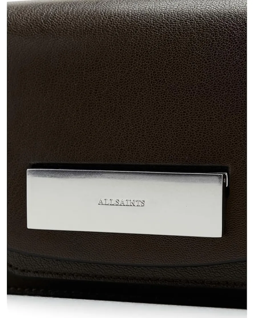 - Chic meets sleek, AllSaints™ Etta Clutch. Crafted from premium leather with a luxe leather lining, this statement piece features a new branded hinge push-lock closure that adds a modern twist to a timeless silhouette. It’s a roomy single compartment with an interior pocket that keeps your essentials secure and organized, phone, cards, keys, and more. Whether carried by hand for an ultra-minimalist vibe or worn with the removable chain strap for hands-free glam, it’s the kind of clutch that turns heads wherever you go.