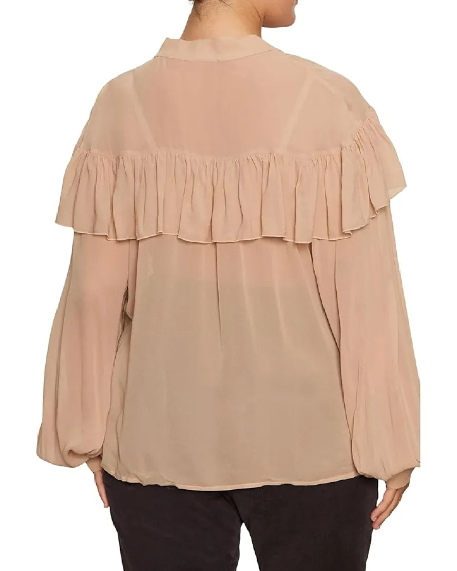 - The Sanctuary™ Fade Into You Ruffle Blouse brings soft structure and feminine detail to your wardrobe. Crafted from lightweight fabric, it features ruffle accents along the neckline and cuffs with a relaxed silhouette that drapes effortlessly.