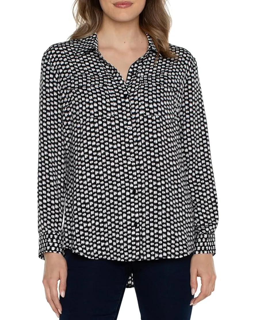 - Elevate your casual wardrobe with the Liverpool™ Flap Pocket Button Front Woven Blouse. This classic top features a spread collar neckline, and long sleeves with buttoned cuffs for a signature look. Crafted from polyester it has an allover dot print.