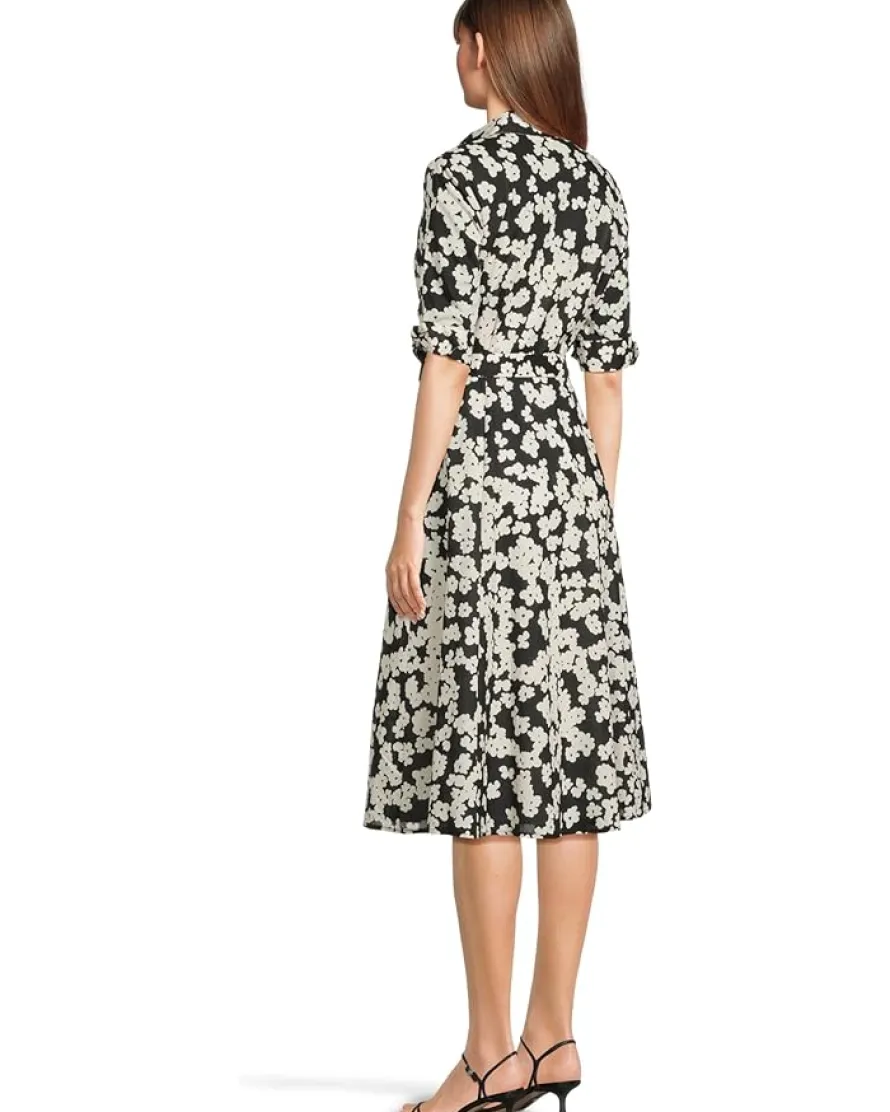 - Look graceful in the Calvin Klein® Floral Cotton Shirt Dress. This A-line dress features collared neckline, elbow-length sleeves, allover printed design, midi-length silhouette, and self-tie front detailing.