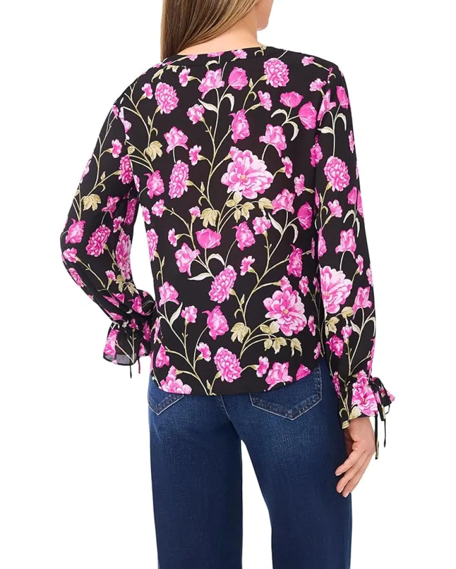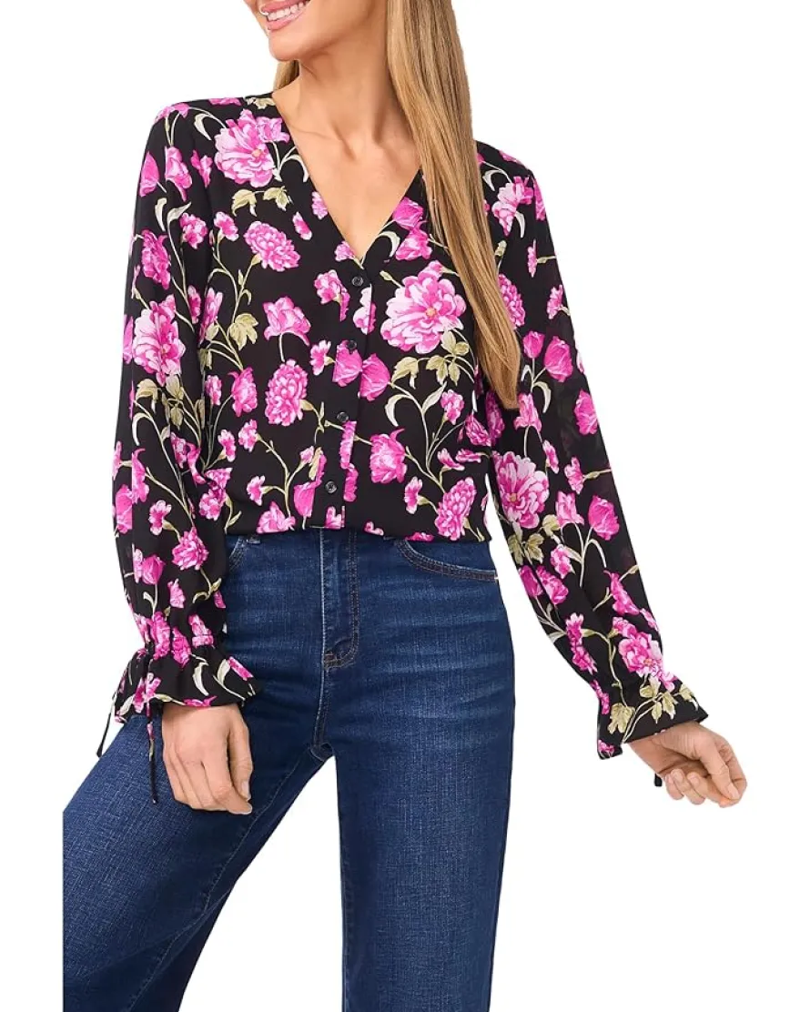 - The CeCe™ Floral Printed Button Front Long Sleeve Top is the perfect balance of playful and polished. The beautiful floral print, V-neckline, and the long sleeves with tie sleeve cuffs, make this button-front top perfect for any occasion!