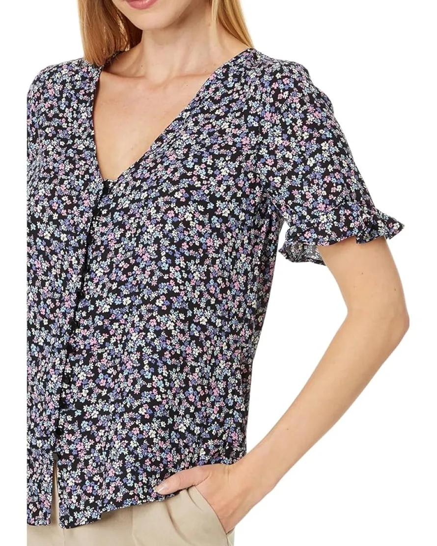 - Stand out in style wearing the CeCe™ Floral Ruffled Sleeve Button-Up Blouse. This classic fit top features V-neckline, buttoned front closure, allover eye-catching print, short sleeves, and straight hem.