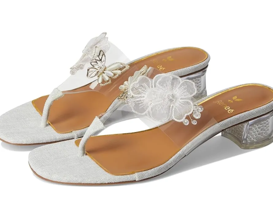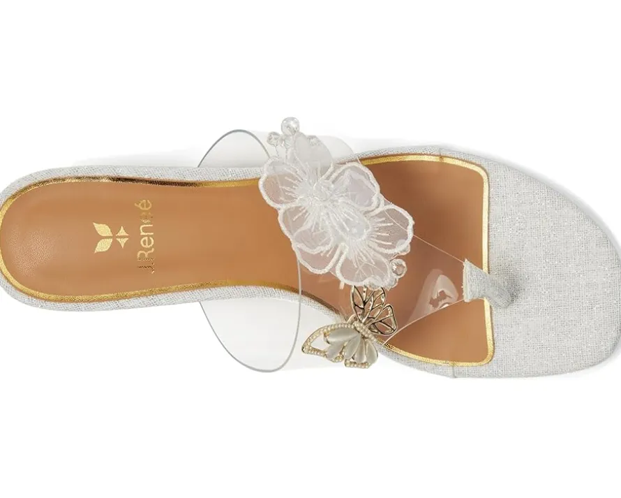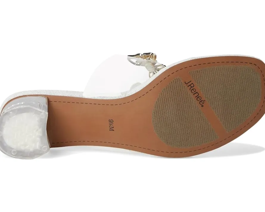 - Imagination, underfoot styling J. Renee® Flowerfly. Designed to turn heads, this stunning slip-on sandal boasts a sleek PU upper and transparent vinyl square toe, adding a modern, ethereal touch to your look. The novelty heel brings playful elegance, perfect for making a statement at any event. Comfort meets couture with a plush memory foam + latex insole, offering all-day support, while the synthetic rubber outsole ensures a steady stride.