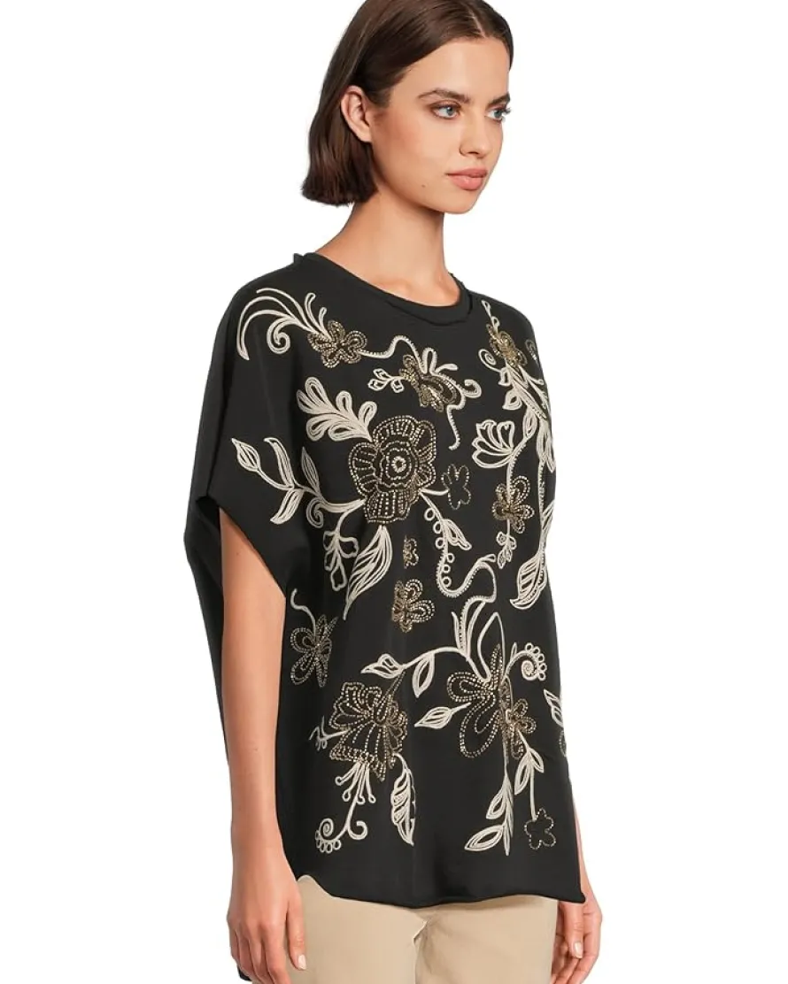 - Say goodbye to wardrobe dilemmas with the simple yet stunning Johnny Was® French Terry Poncho. The pull-on style top features a crew neckline, short sleeves, a high-low hem, and is finished with allover embroidery and bead detailing on the front.