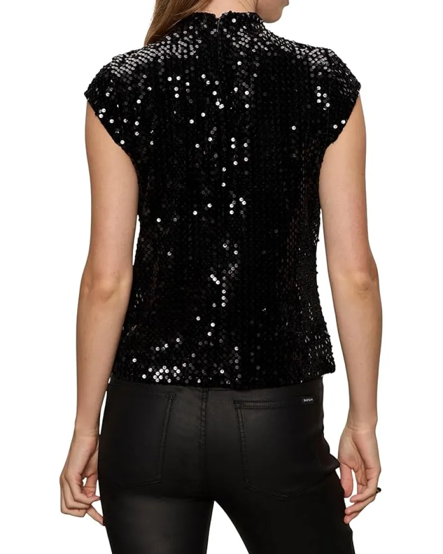 - Dazzle at your next outing in the Sanctuary™ Funnel Neck Sequin Top. Featuring a funnel neckline with cap sleeves, back zipper closure, straight hemline, and allover sequin detailing.
