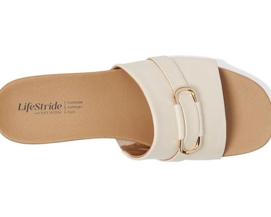 - Effortless chic, redefined: LifeStride® Genevieve effortlessly blends casual comfort with refined style. These chic slide sandals are designed with faux leather or woven fabric, a soft square open toe, and a slip-on fit that makes getting ready a breeze. The metallic ornament detail adds just the right touch of glam to elevate any outfit, from laid-back weekends to evening strolls. Crafted with Soft System® comfort technology, the foam insole and synthetic rubber outsole provide unbeatable cushion, support, and flexibility. The traction sole ensures stability with every step, while the partially recycled linings offer eco-friendly appeal. These slides are the perfect blend of fashion and function, ready to complete your closet essentials.