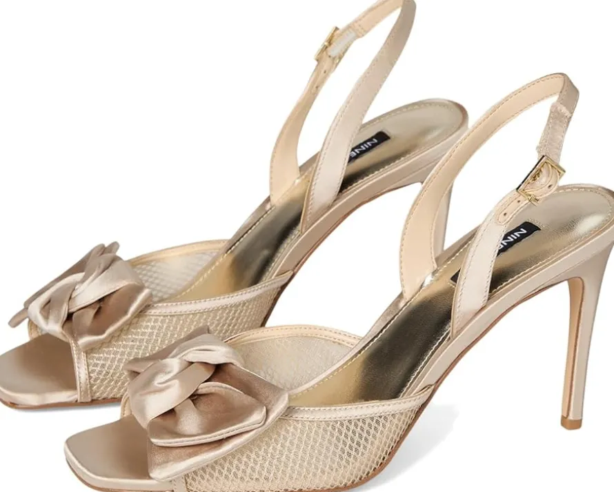 - Turn heads wearing the Nine West® Gergia sandals. These dress sandals feature sky-high stiletto heels, a bow detailing on the upper, and an open, square toe shape for a more elevated look. These heeled sandals are made of a textile upper, cushioned insole, and polyurethane lining. The slingback strap ensures a perfect fit. These stylish heels are anything but boring.