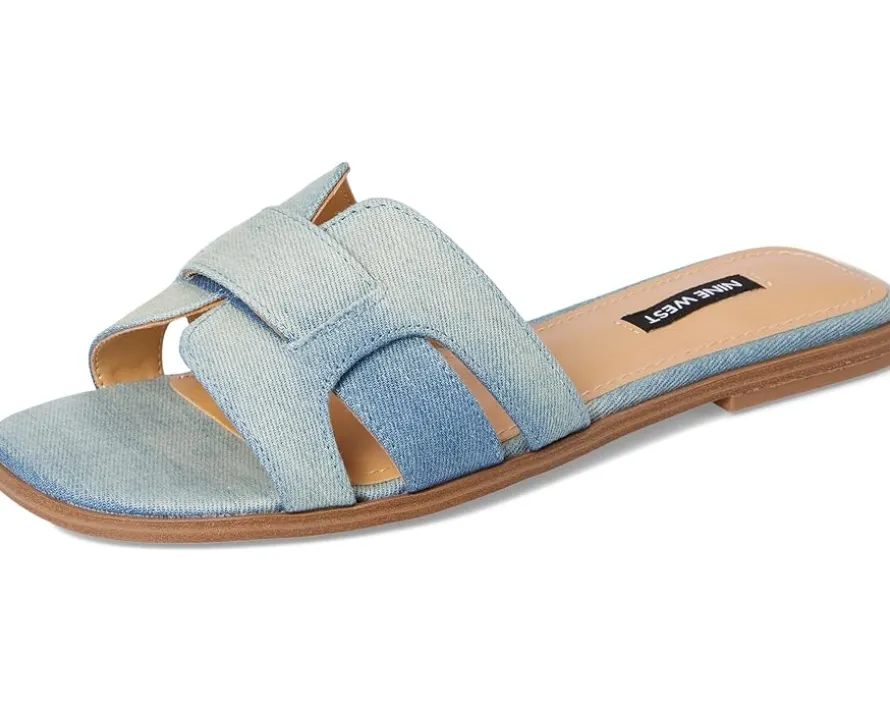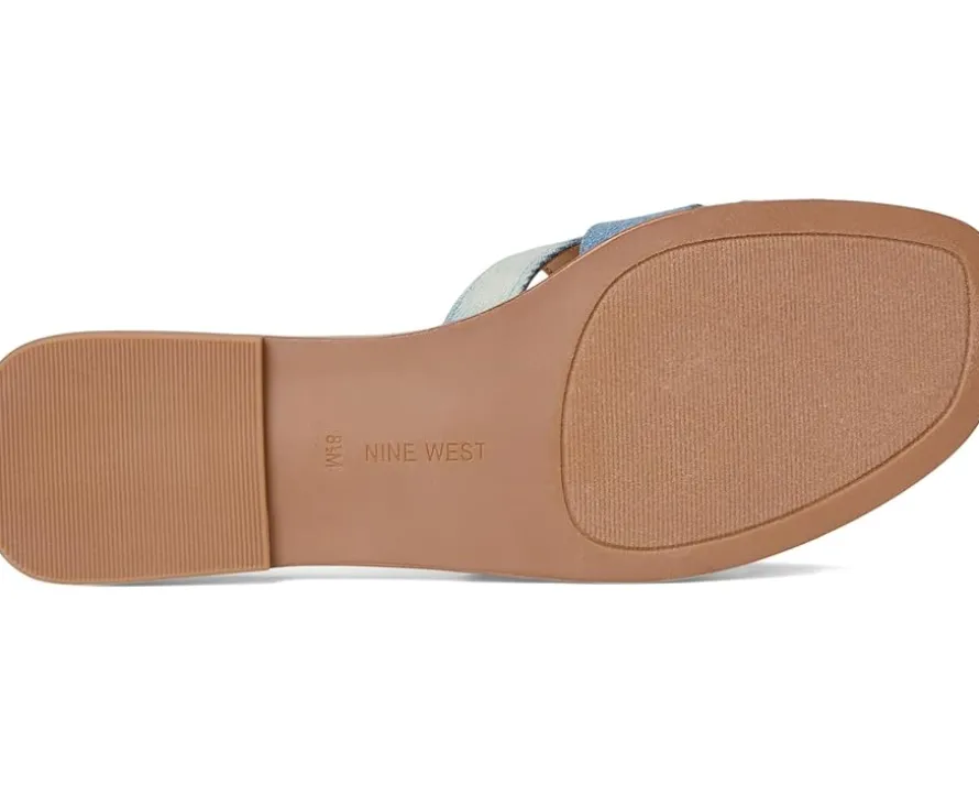 - Step lightly in style wearing the Nine West® Germani. Crafted from leather upper, man-made lining, this pair of sandals features open round toe, slip-on style, flat heel, and brand detailing on the footbed.