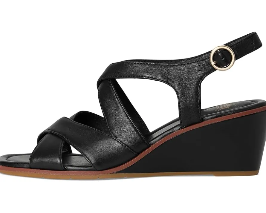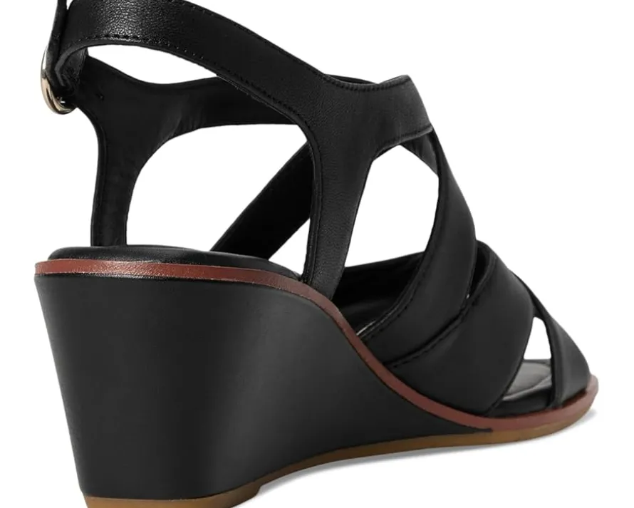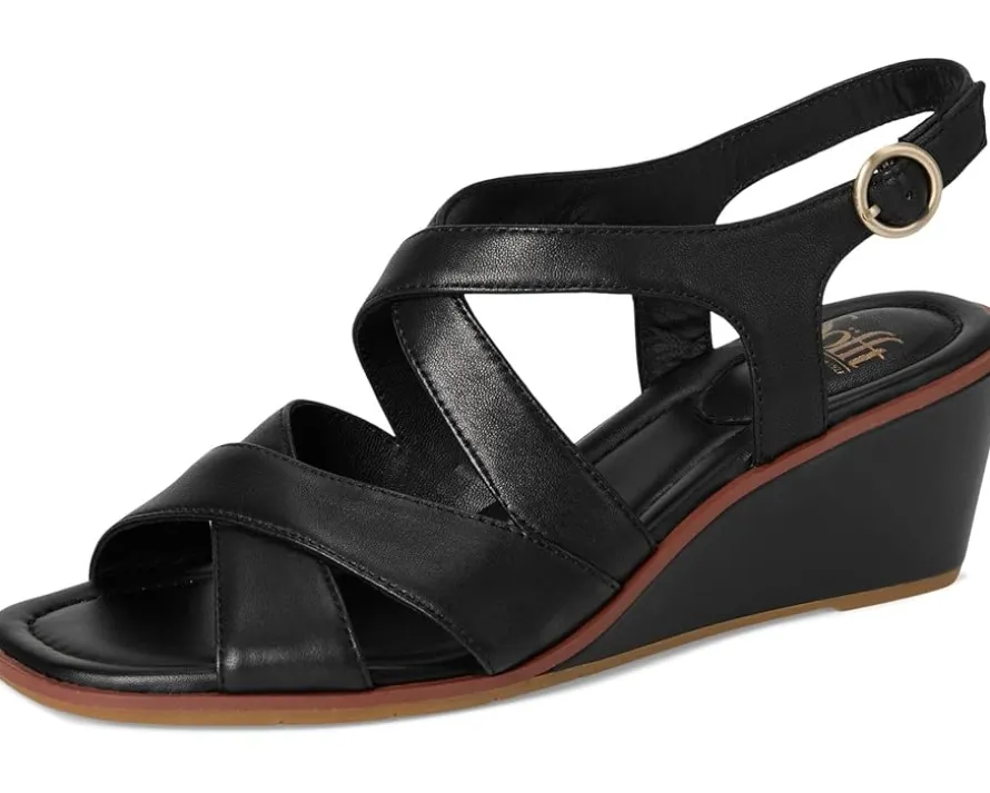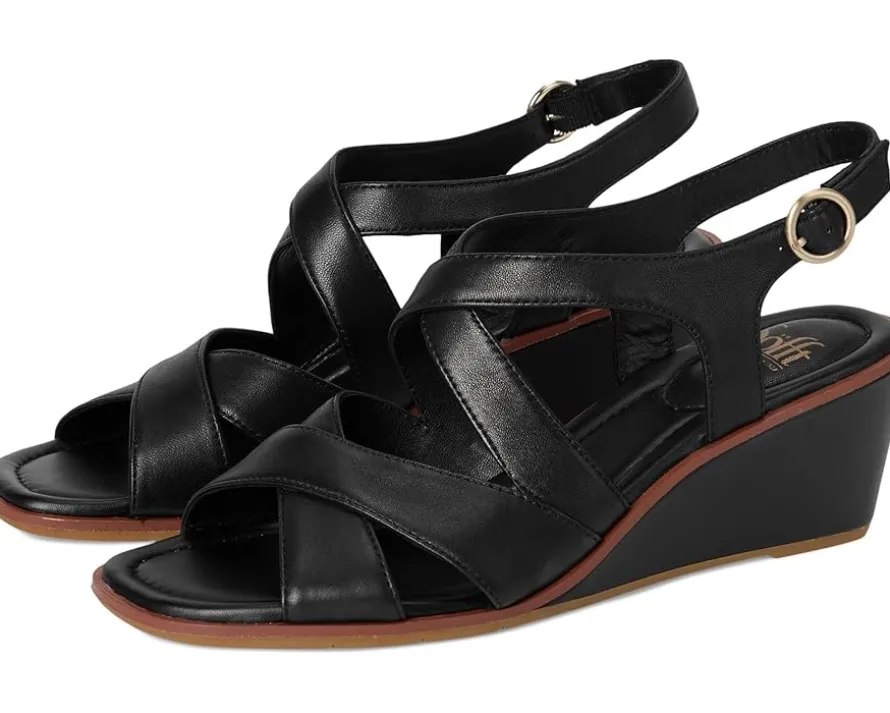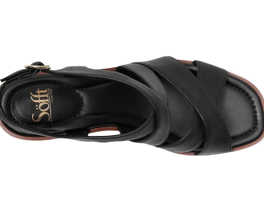 - Elevate your classic look wearing the Sofft® Gigi. The cross-banded design catches the eye, while the cushioned footbed provides arch and heel support for added comfort. Crafted from leather upper, and breathable leather lining, this pair of sandals features open round toe, wedge heel, adjustable slingback strap closure, and brand detailing on the footbed.