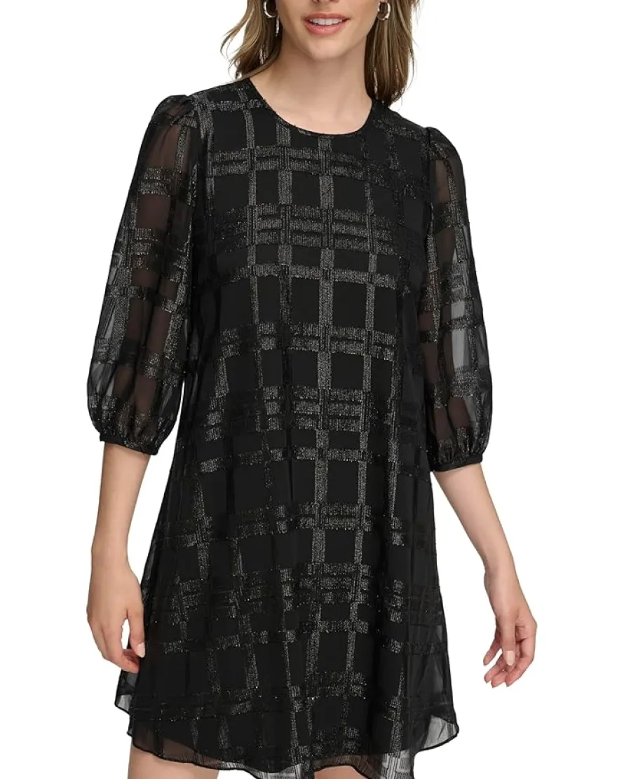 - Elbow-length chiffon balloon sleeves and a round neckline.