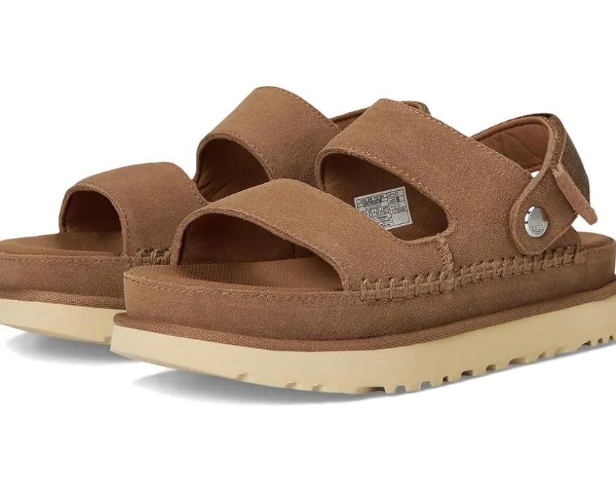 - Ready, set, glide. The UGG® Goldenstar Glide brings convertible comfort to all of your sunny-day excursions. It’s designed with an adjustable heel strap that can flip to the front for slide-like access when you’re on the go. The contoured footbed is lined with soft, recycled material infused with fresh-keeping treatment to keep you feeling fresh. It comes with webbing heel strap, hook-and-loop closure, contoured EVA footbed, Sugarcane EVA® midsole made with recycled EVA regrind.
