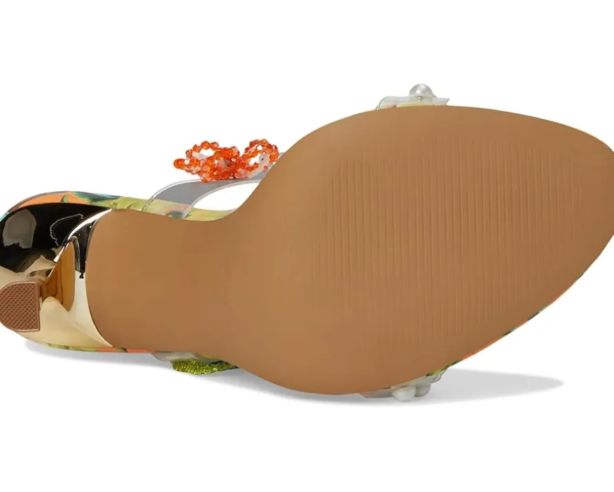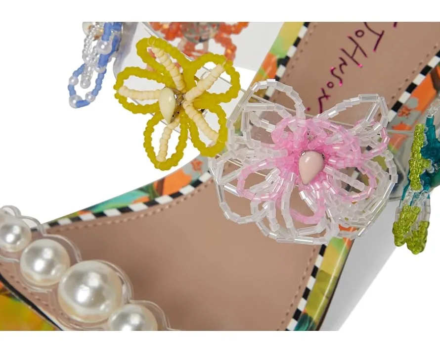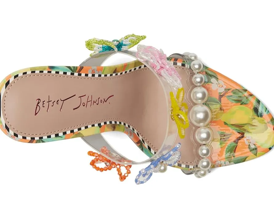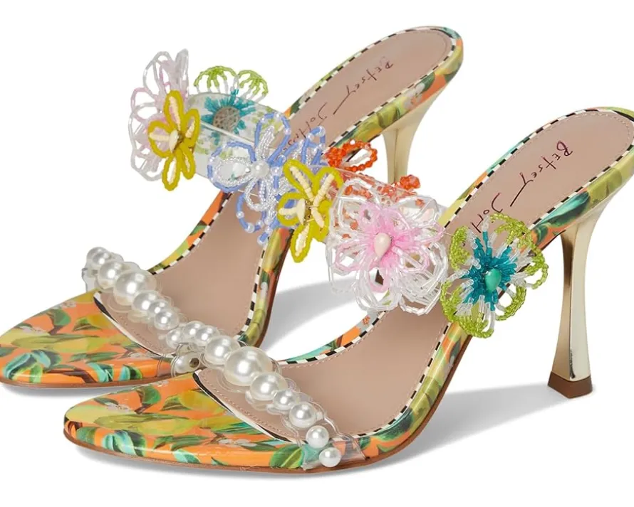 - Perfect for any fashionista, the Blue™ by Betsey Johnson Goldiee is sweet and girly, with its bright print and flower embellishment. The stiletto mule heels feature faux leather upper adorned with pearls and beaded flowers, faux leather lining, and insole.